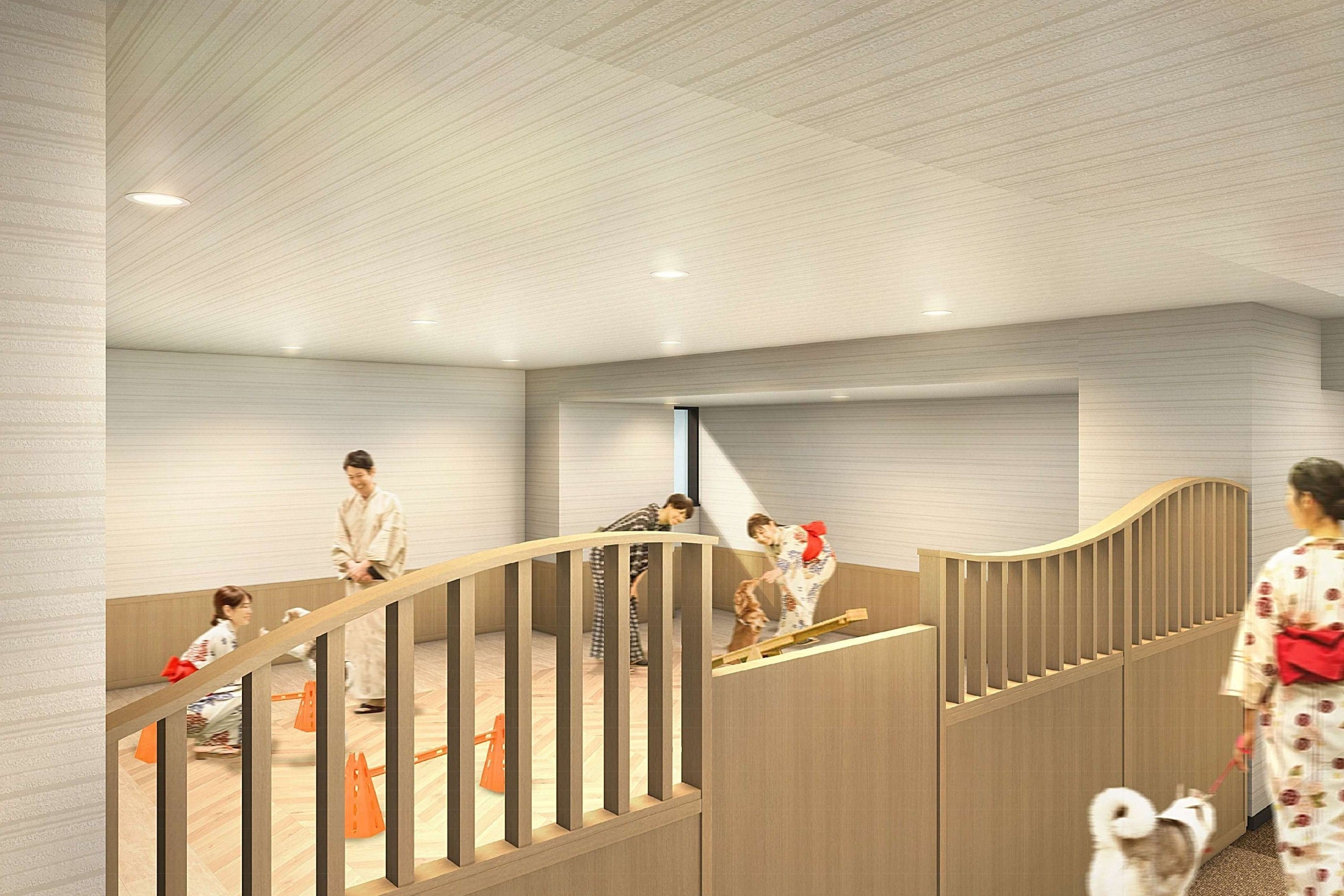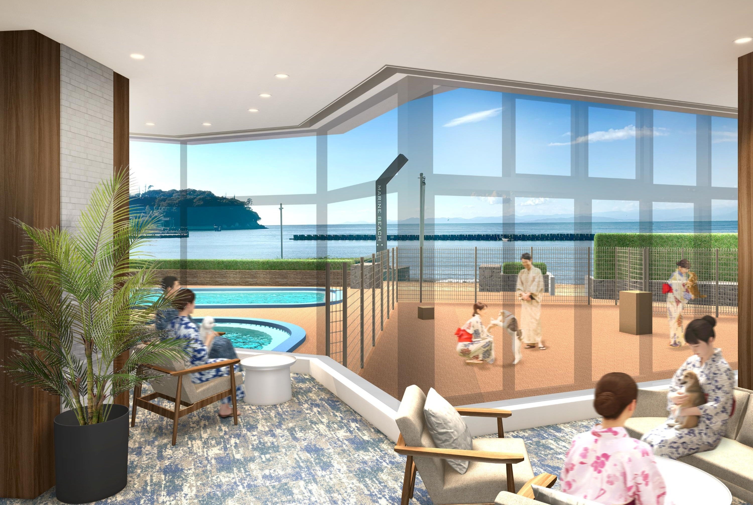 プールデッキの一部を改修し約200㎡の屋外ドッグランを新設いたします。わんちゃんも自然の潮風を浴びながら遊ぶことができます。館外へはロビーから出入り可能で、わんちゃん用の足洗い場も設置します。また、天候を問わず楽しめる約35㎡の屋内ドッグランも新設いたします。そのほか、グルーミングコーナーなどわんちゃん用の設備が充実します。