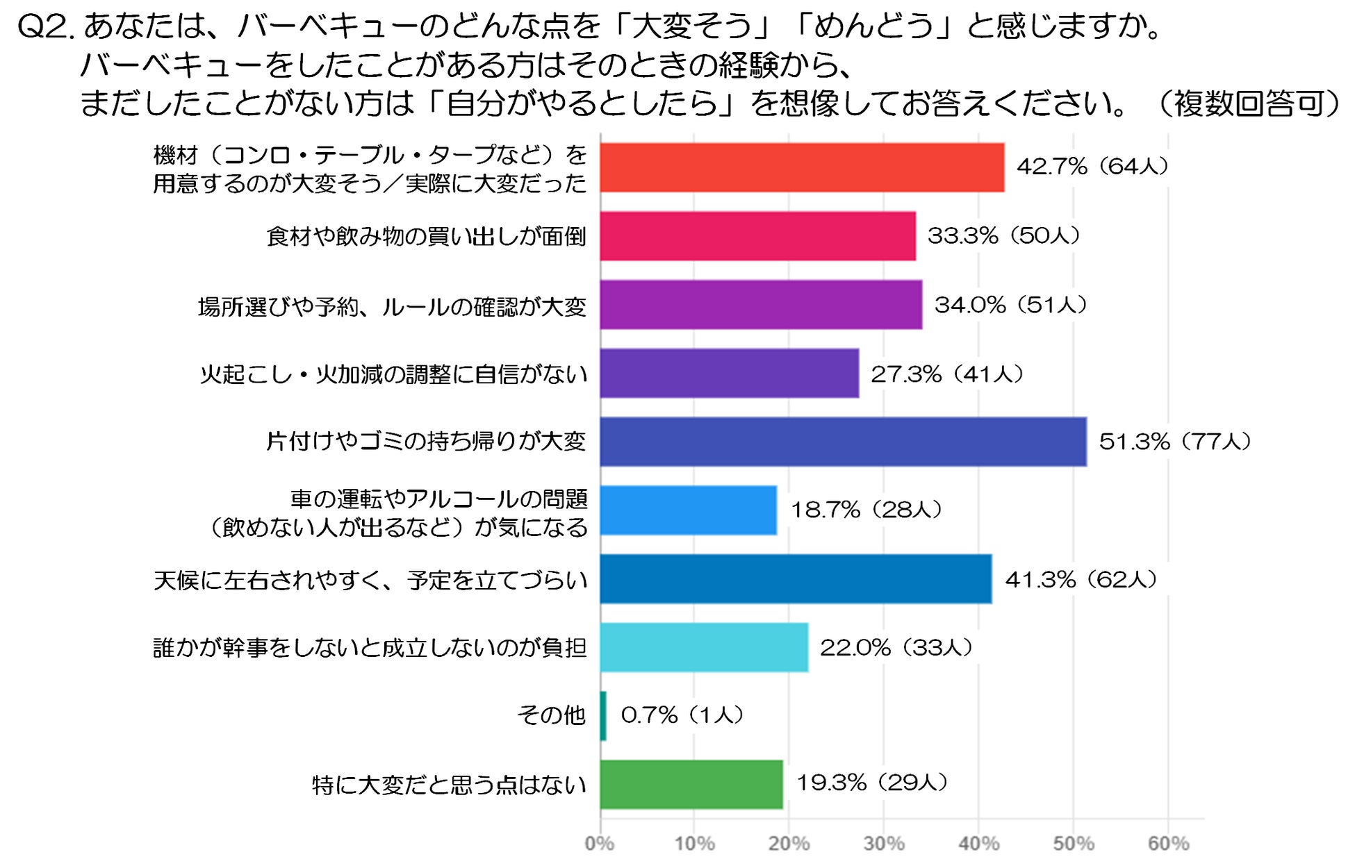 最も多かったのは「片付けやゴミの持ち帰りが大変」で、51.3%(77人)と半数を超えています。バーベキューといえば楽しい時間が注目されがちですが、終わった後の後始末を負担に感じている人が非常に多いことが分かります。準備よりも「終わった後」を想像したときに、気持ちが重くなる人も少なくなさそうです。