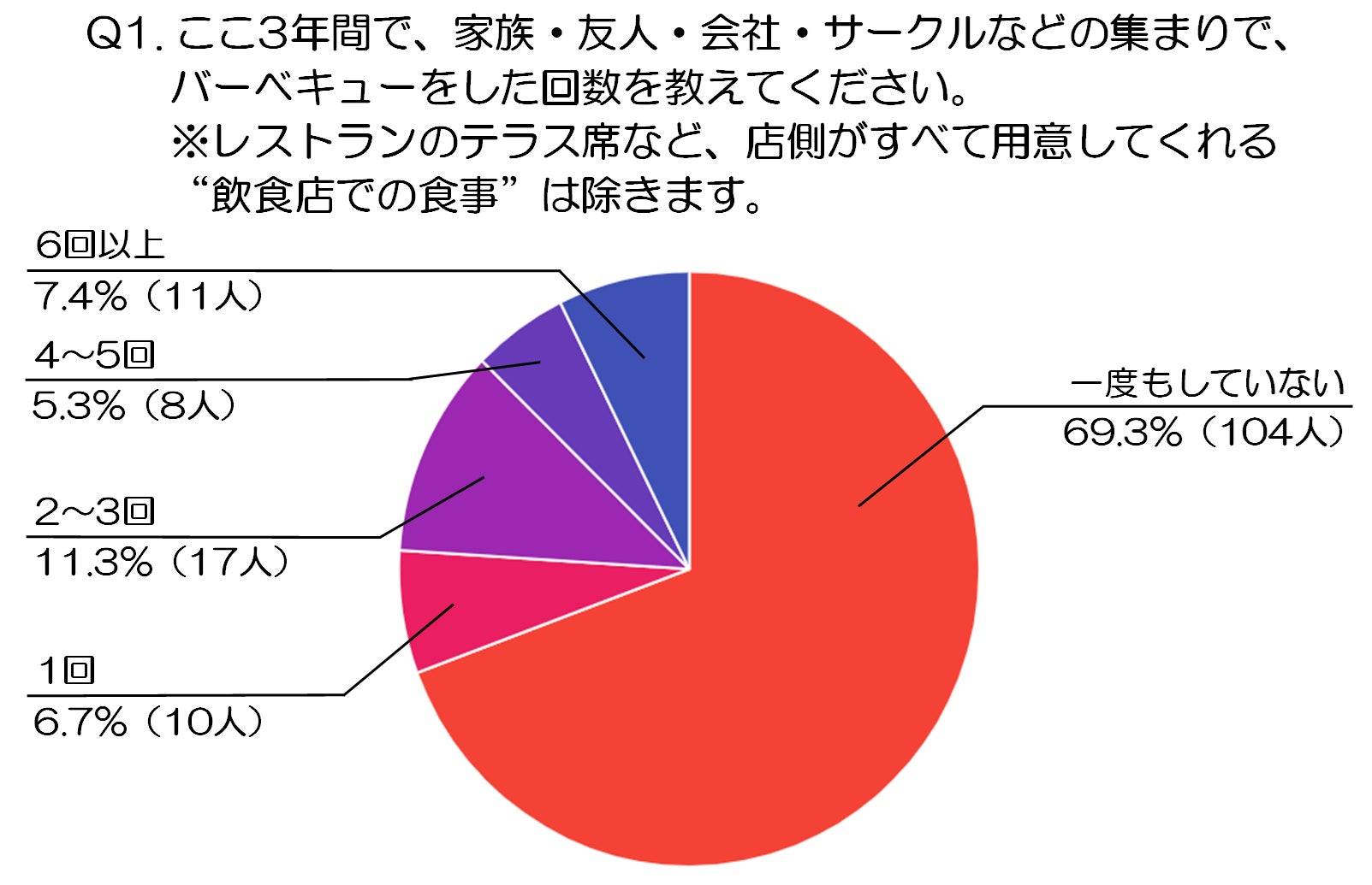 最も多かったのは「一度もしていない」という回答で、69.3%(104人)と全体の約7割を占めました。見方を変えると、「まだ体験できていない=これから楽しみが残っている人が多い」結果ともいえます。実際、「やりたい気持ちはあるけれどタイミングが合わなかった」「予定は考えたものの実行までは至らなかった」といった層も含まれると考えられ、バーベキューは“気になるイベント”として心の中に残り続けていることがうかがえます。