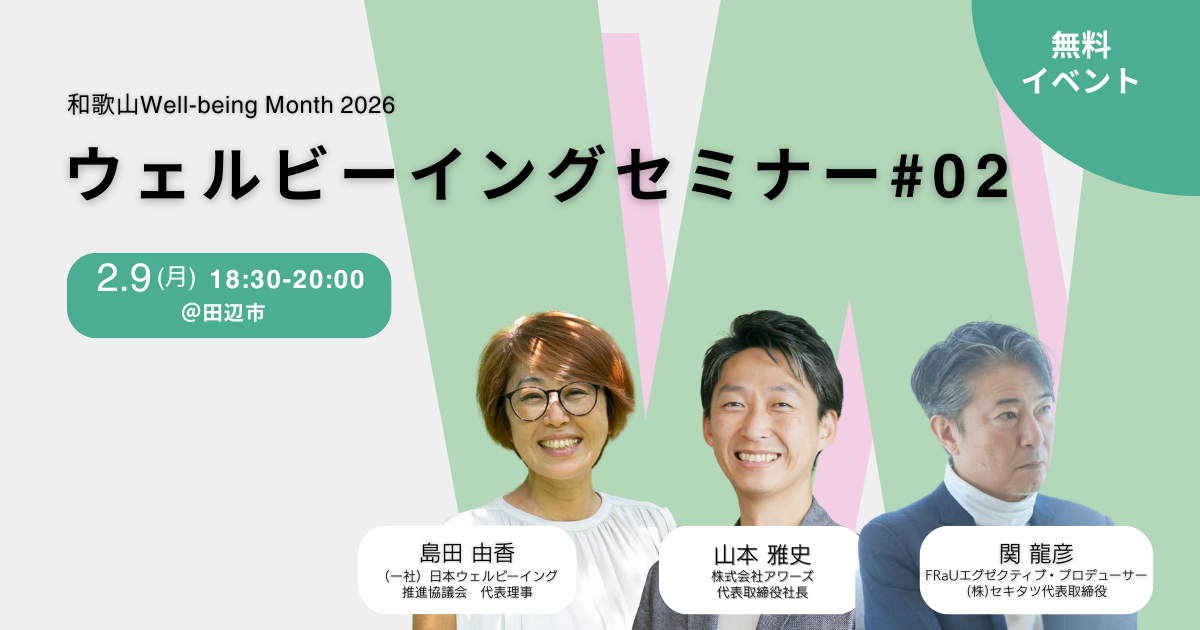 そのためのヒントがいっぱい詰まったセミナーや、実際に体を動かすことでウェルビーイングを実体験できる魅力的なイベントがぎゅっと集まった1ヶ月間。2月の和歌山で心も体も頭も使って、是非ご自身のウェルビーイングを知ってください。日本のウェルビーイングの底上げをすることが私のパーパス(大いなる目的)です。それを地域を通じて実現していきたい。その舞台として私の大好きな場所である和歌山を選んだのは、和歌山にはウェルビーイングであれる要素がいっぱいにあふれているからです。和歌山からウェルビーイングを広げていきたい。“また来たい・また会いたい”と思えるつながりを、この和歌山の地から全国、そして世界へ届けていきます。たくさんの皆さまのお越しを和歌山でお待ちしています。