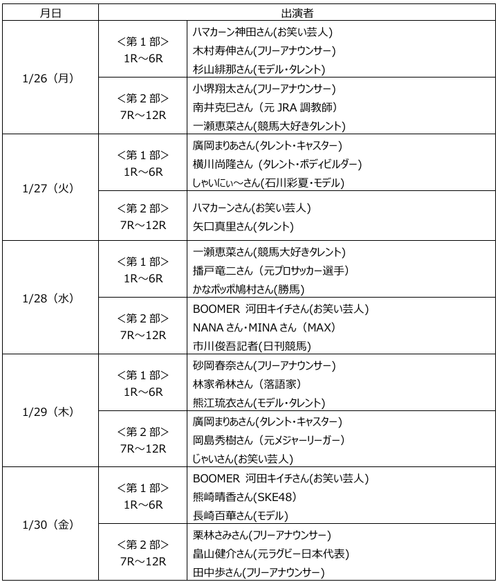 そのほか、1月26日(月)には、元JRA調教師の南井克巳さん、1月28日(水)には元プロサッカー選手の播戸竜二さん、1月30日(金)には、元ラグビー日本代表の畠山健介さんが初出演!さまざまな分野で活躍する豪華メンバーが連日お届けする「ウマきゅん」をどうぞご覧ください!