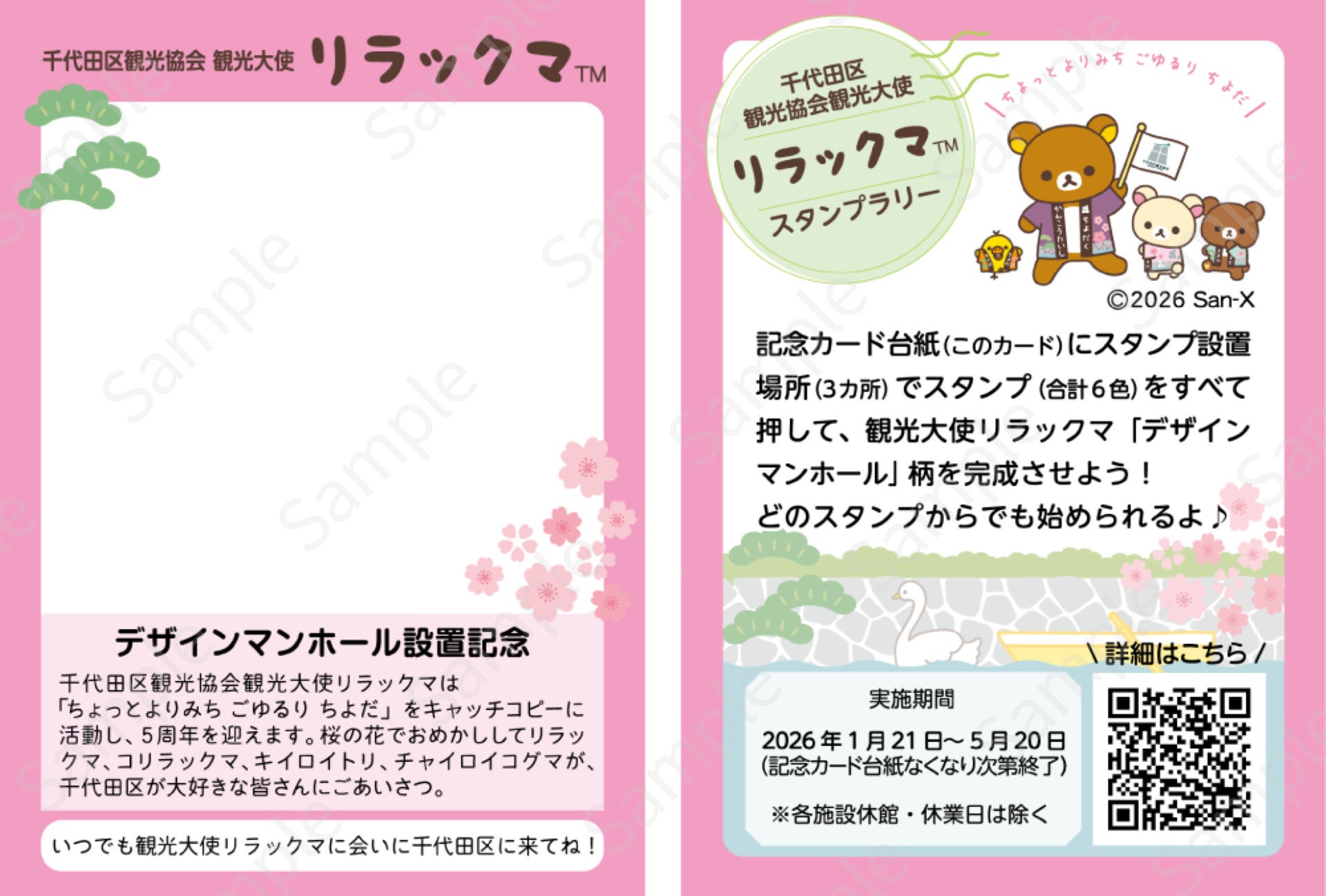 デザインマンホールの設置を記念して、記念スタンプラリーを開催します。記念カード台紙にスタンプを押して、リラックマのマンホール絵柄を作成いただけます。千代田区観光案内所、KANDA SQUARE、テラススクエアの3施設を回っていただき、合計6色のスタンプを押すと記念カードが出来上がります。