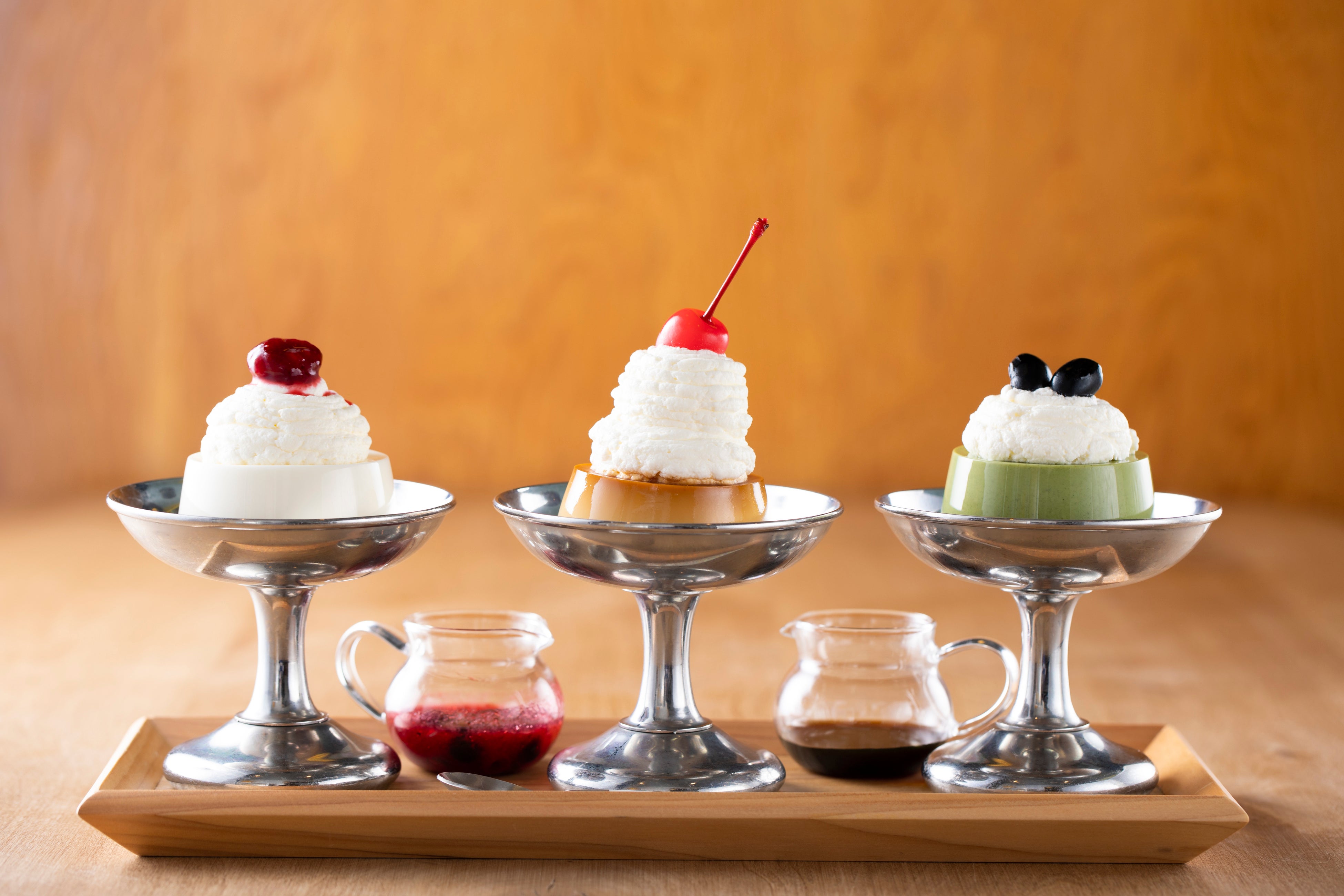 多賀地区にある⻑浜海⽔浴場の⽬の前にあり、「熱海プリン」で唯⼀⾷事メニューを提供。デコレーションされたプリンをはじめ、ふわふわのプリンパンケーキ、自慢の卵を使ったドレスオムライスなどがいただけます。シェアして食べたい「ジャンボ皿プリン」などのジャンボメニュー、自由に絵が描けるキッズスペースなど、みんなで楽しめる要素がたっぷり揃ったお店です。