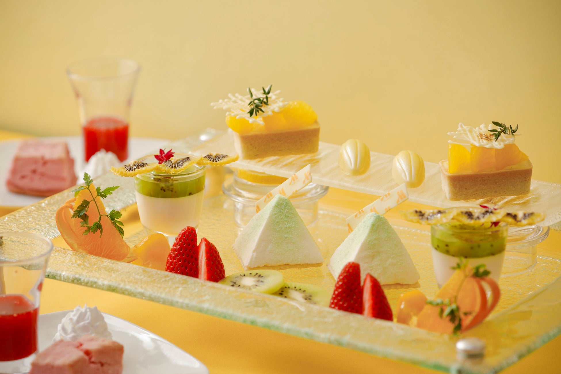 和歌山県産のフルーツをふんだんに取り入れたイブニングハイティー付き宿泊プランをご用意いたしました。セイボリーには梅の香りを加えたチーズと桜エビのみかんガレット、アスパラガスと八朔のオーブンパン粉焼きなど春の訪れを感じる6品を取り揃えています。彩り豊かなスイーツには甘夏のコンフィチュールを添えたフロマージュや、キウイフルーツのベリーヌ仕立てなどをご用意しました。さらに当プラン限定で、古座川町産キウイジャムを使ったオリジナルウェルカムドリンクをご提供いたします。春の果実が咲き誇るような華やぎを是非ご賞味ください。