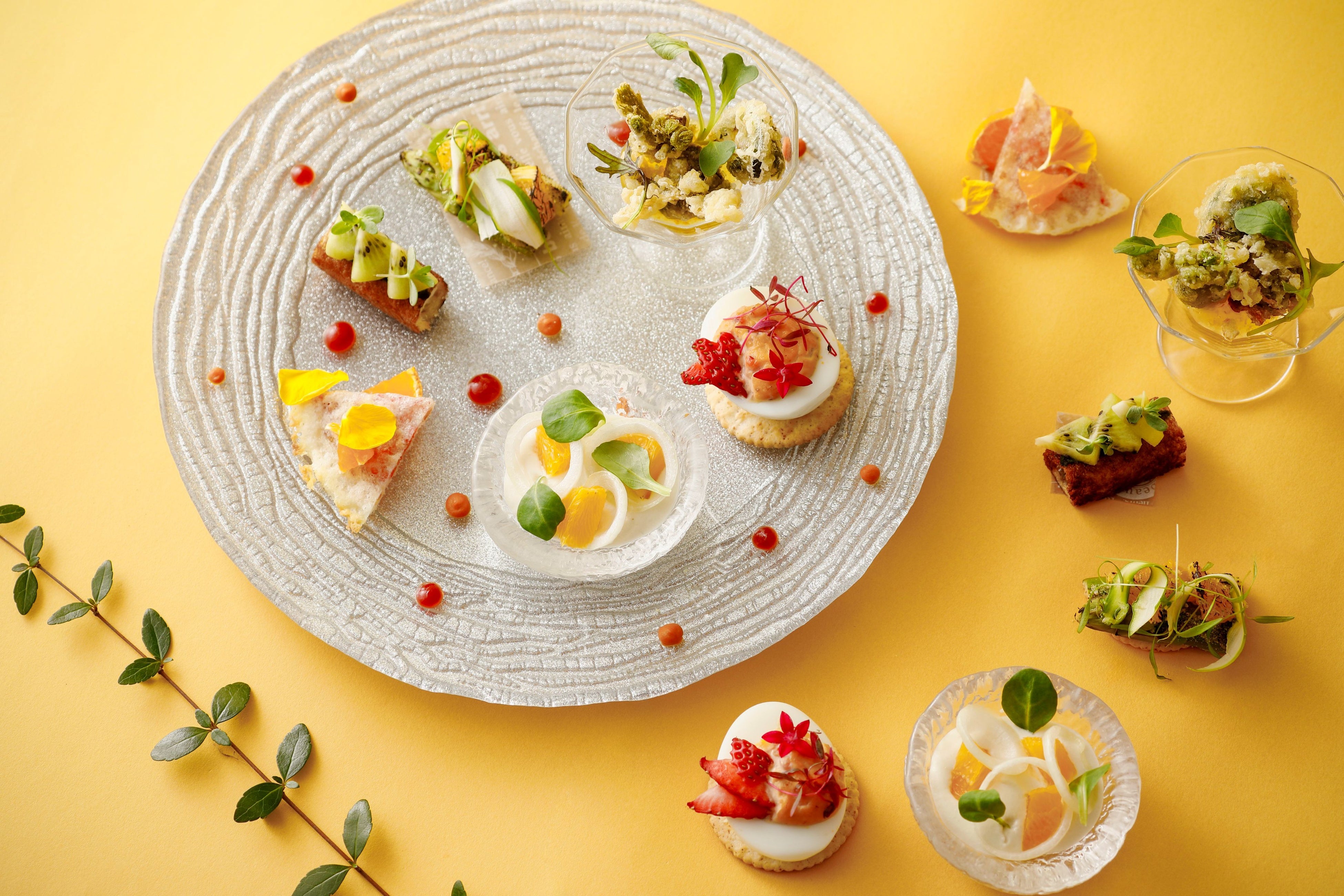 和歌山県産のフルーツをふんだんに取り入れたイブニングハイティー付き宿泊プランをご用意いたしました。セイボリーには梅の香りを加えたチーズと桜エビのみかんガレット、アスパラガスと八朔のオーブンパン粉焼きなど春の訪れを感じる6品を取り揃えています。彩り豊かなスイーツには甘夏のコンフィチュールを添えたフロマージュや、キウイフルーツのベリーヌ仕立てなどをご用意しました。さらに当プラン限定で、古座川町産キウイジャムを使ったオリジナルウェルカムドリンクをご提供いたします。春の果実が咲き誇るような華やぎを是非ご賞味ください。