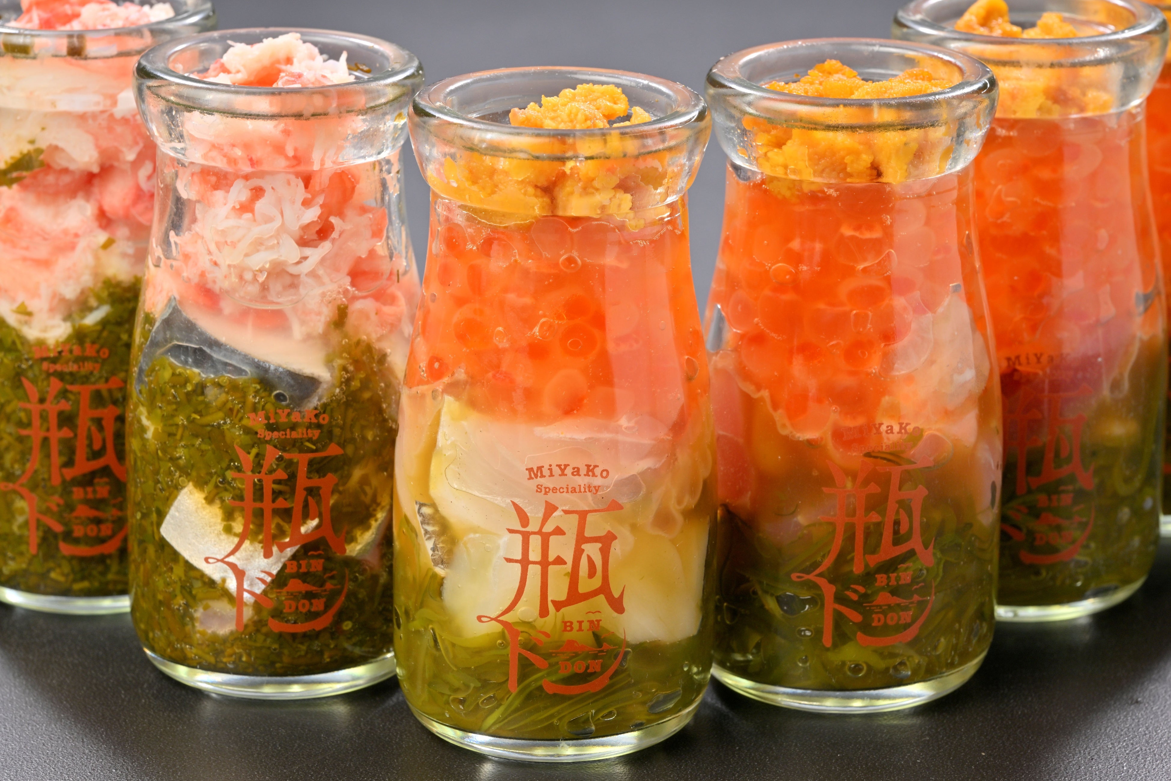 「瓶ウニ」をヒントに生まれた宮古名物の体験型グルメ「瓶ドン」。瓶に詰めた海の幸をご飯にかけて味わうご当地丼です。
