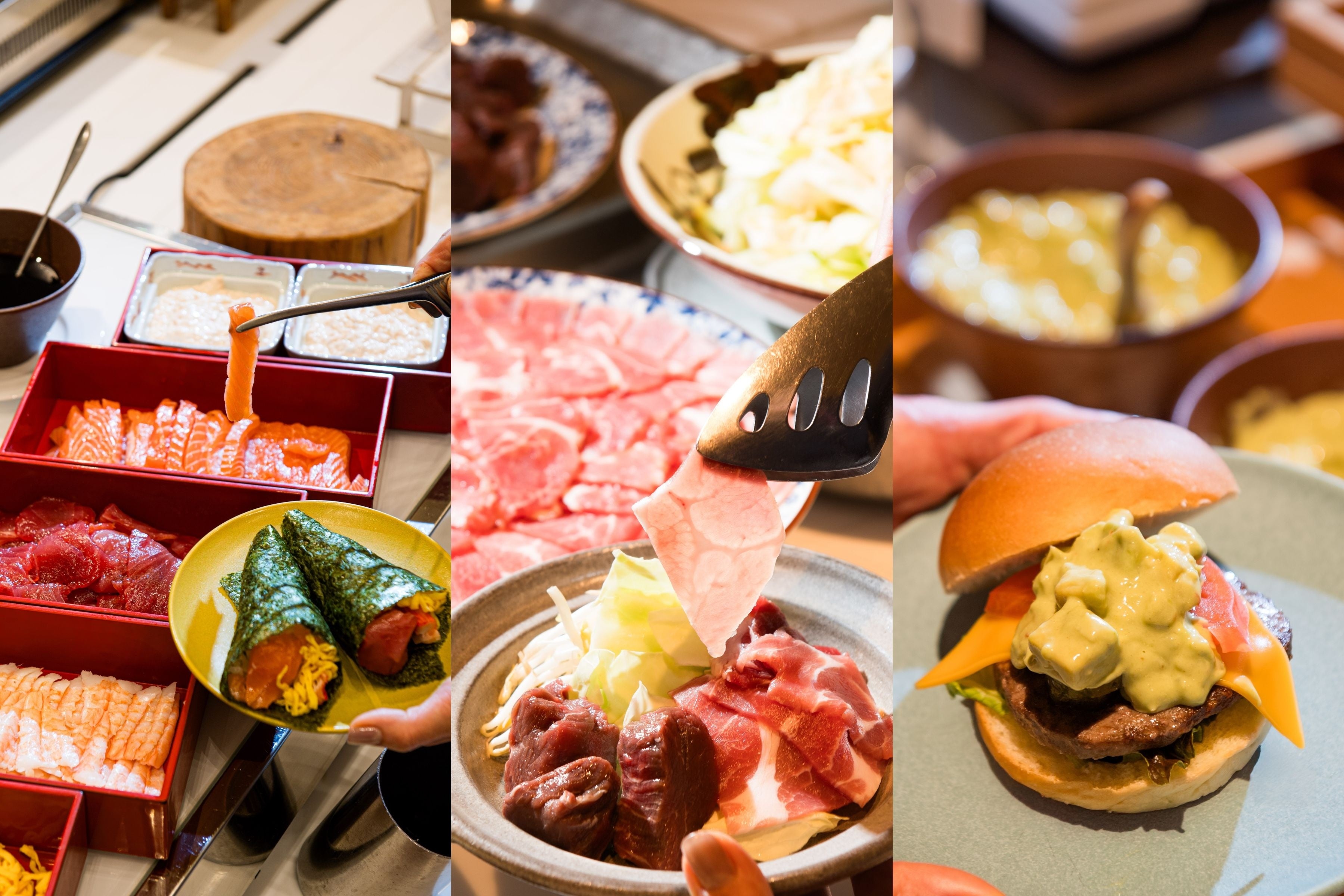 フレッシュなサラダや和洋の豊富なメニュー、デザートまで50種類以上のメニューが並びます。まぐろや海老などの具材を選んで作る手巻き寿司、小ぶりなバンズにビーフパティやチーズ、野菜を挟むハンバーガー、テーブル上で調理し熱々に仕上げた肉を楽しむ陶板焼きなど、お客さま自身でカスタマイズできるメニューを用意。美味しいことはもちろん、同じメニューでも盛り付けや具材の組み合わせによって見た目や味も異なり、「次はそれを食べてみようかな」と会話も弾みます。