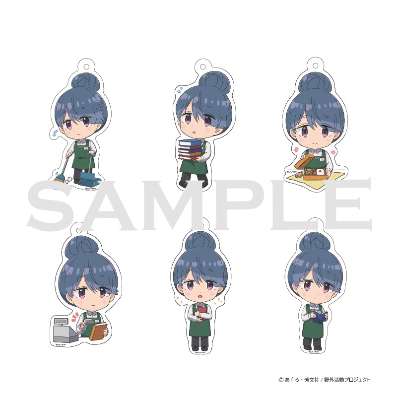 本企画のために描き下ろされた、書店員姿の志摩リンのイラストを展開。アニメ版イラスト3点とミニキャライラスト6点を使用した本企画限定のオリジナルグッズを、丸善ジュンク堂書店の5店舗(東京・名古屋・大阪・福岡)及び『ゆるキャン△』に縁のある「道の駅しもべ」にて限定販売いたします。