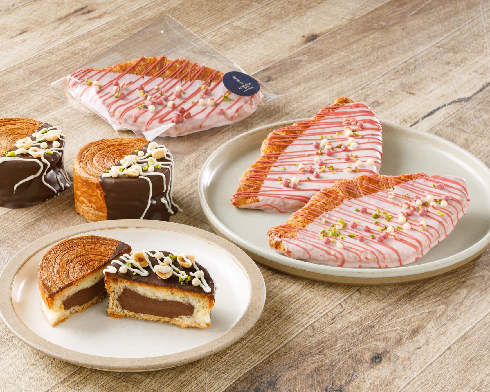渦巻き状に焼き上げたサクサクのクロワッサン生地の中に、濃厚なチョコクリームをたっぷりと閉じ込めました。艶やかなチョココーティングと、香ばしいナッツのトッピングがアクセントに。