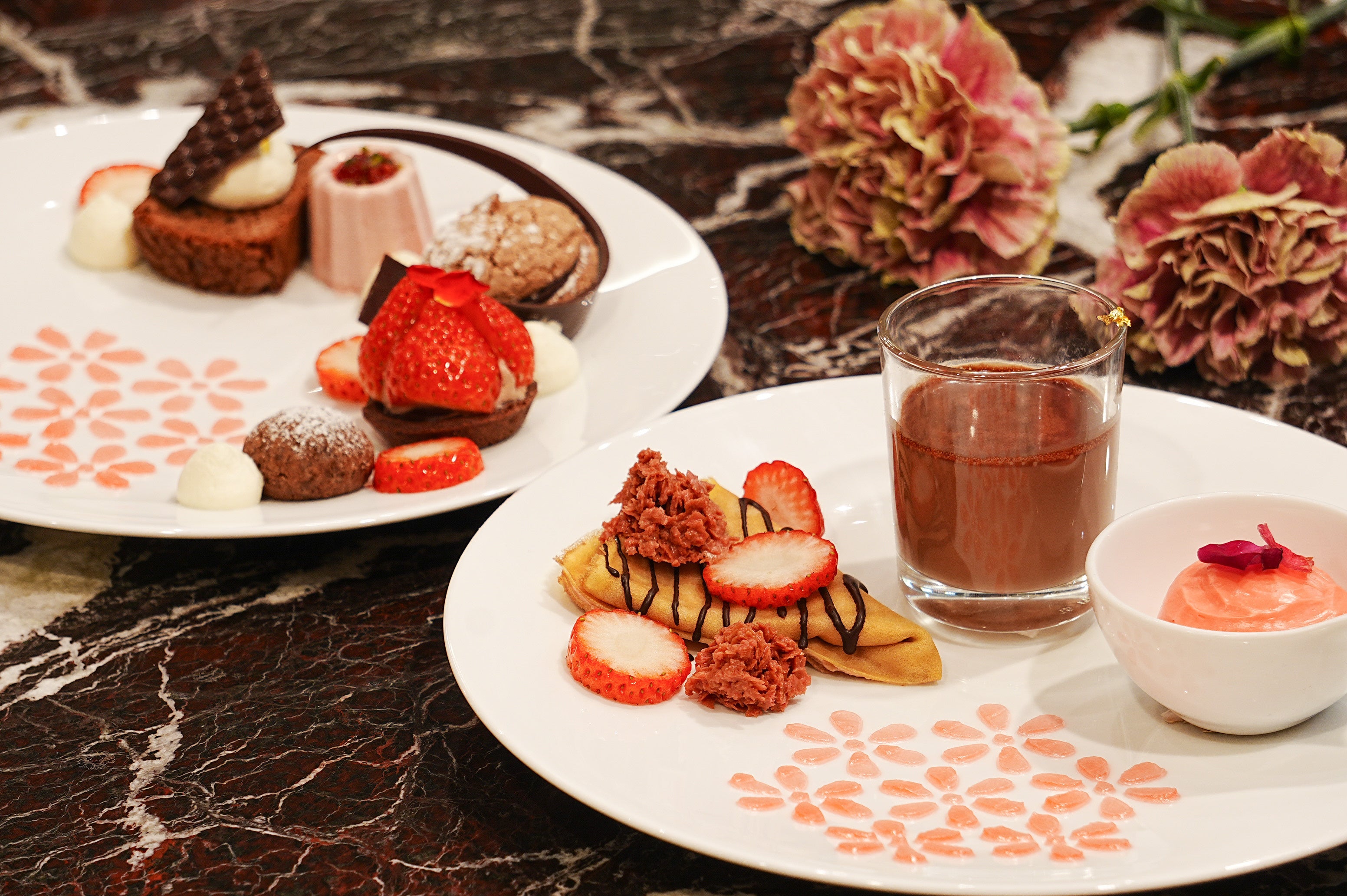 たっぷりのガナッシュとタルト生地の食感、苺の甘酸っぱさが相性抜群のタルトショコラフレーズやムースフレーズ、ガトーショコラ ノワールなど多彩なショコラスイーツをホテルの優雅な空間と共にお楽しみいただけます。