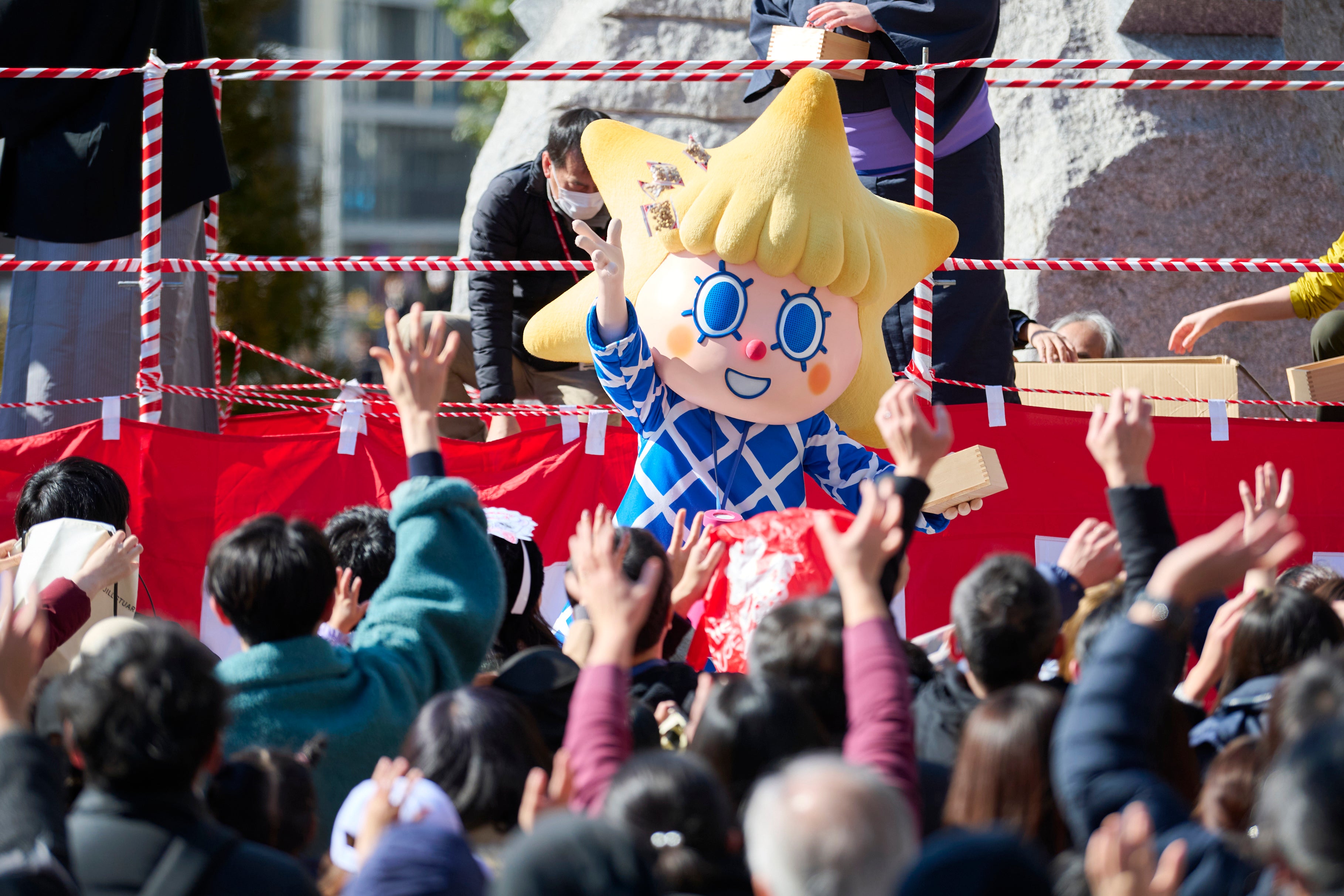 鳴戸親方、鳴戸部屋の力士をはじめ東京スカイツリー公式キャラクター ソラカラちゃんや地元おしなり商店街のイメージキャラクター おしなりくんにより豆まきを行います。