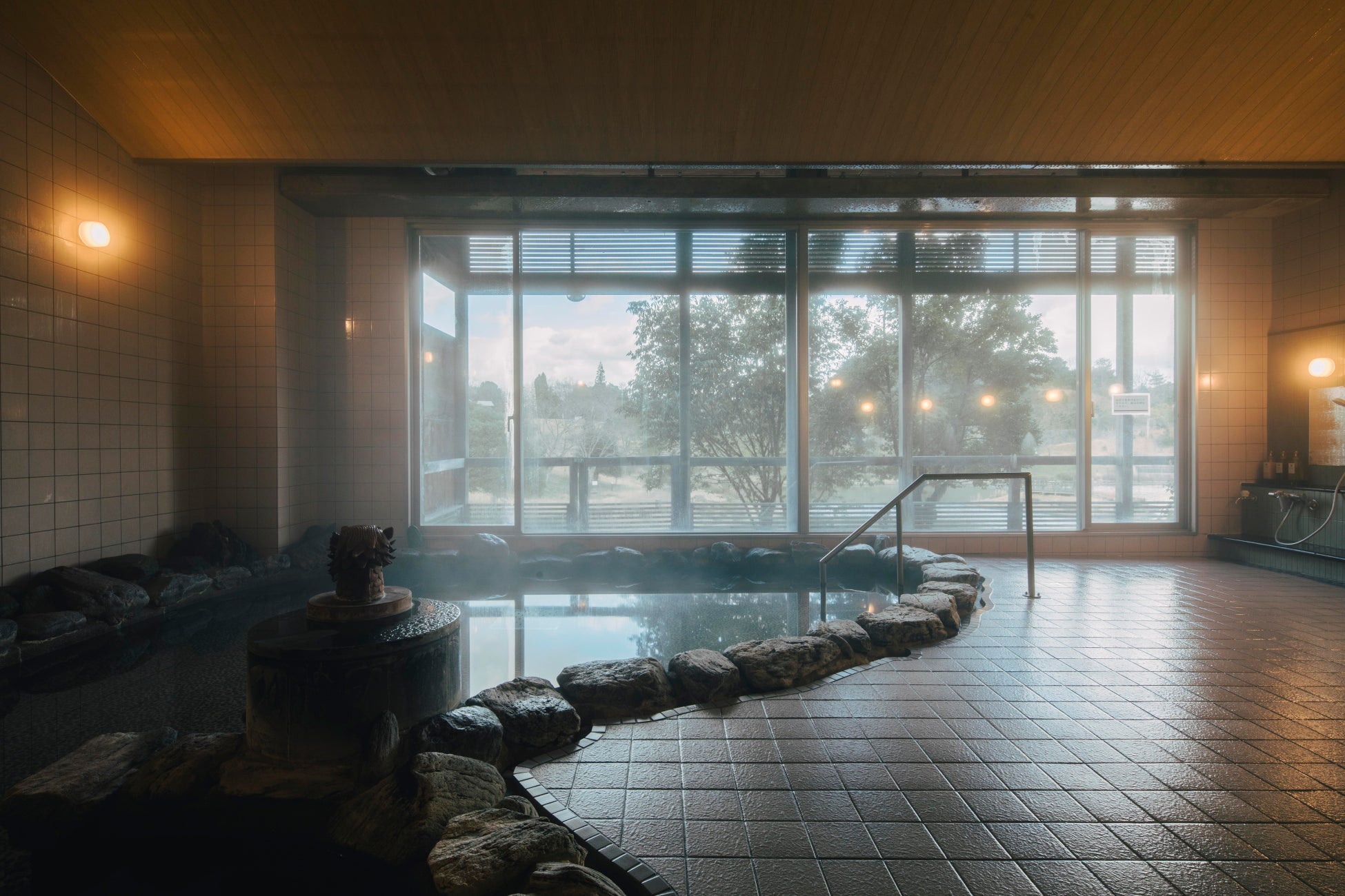 江津市の山間、標高約230メートルの高台にある風の国温泉は、自然に包まれた開放感あふれる温泉です。広い窓から園内の緑や池を望める眺望の良さが魅力で、サウナや打たせ湯など設備も充実しており、ゆったりと身体を整えながら過ごせます。