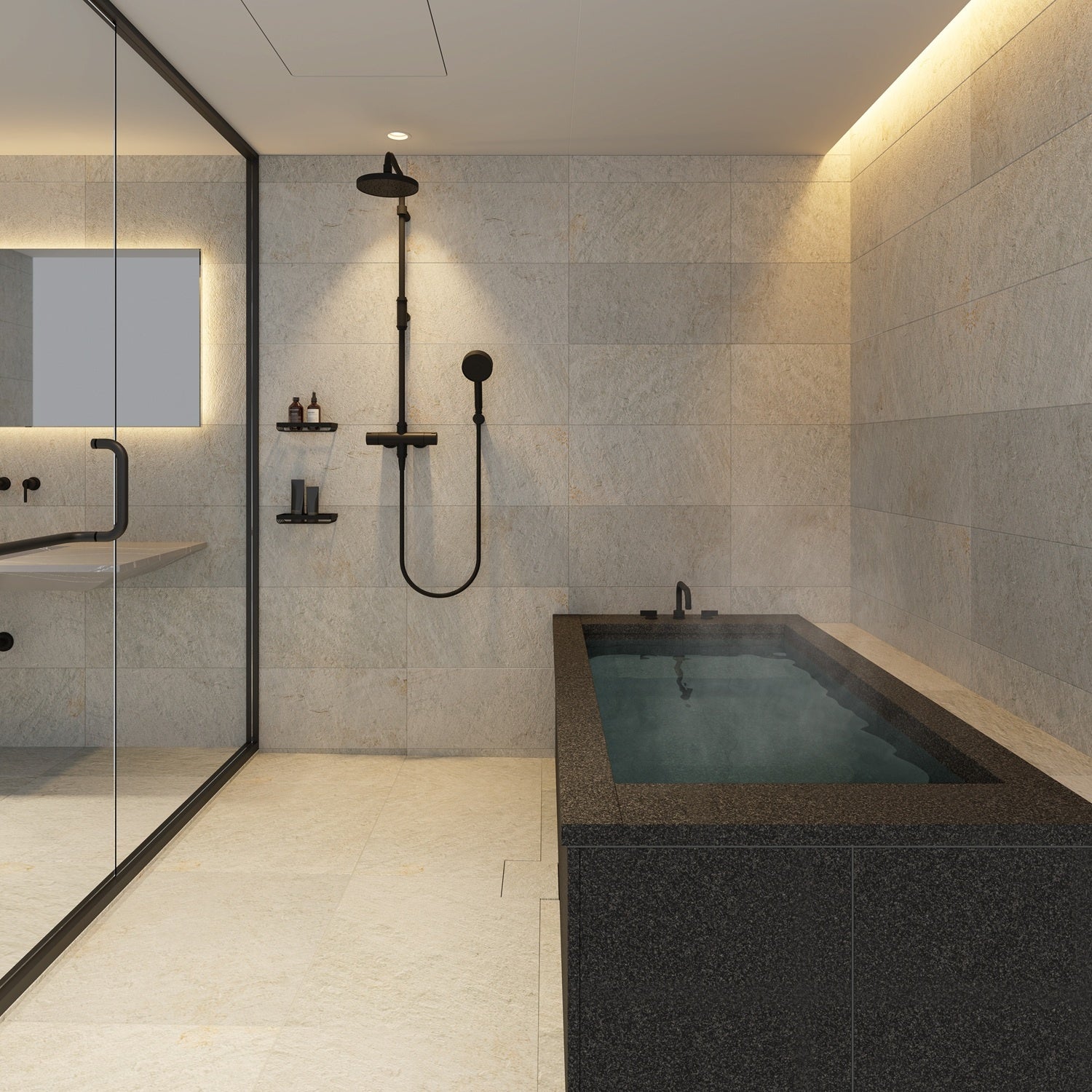 空間全体にはタイル貼り仕上げを採用し、素材感と意匠性にこだわった上質な浴室空間を実現しました。