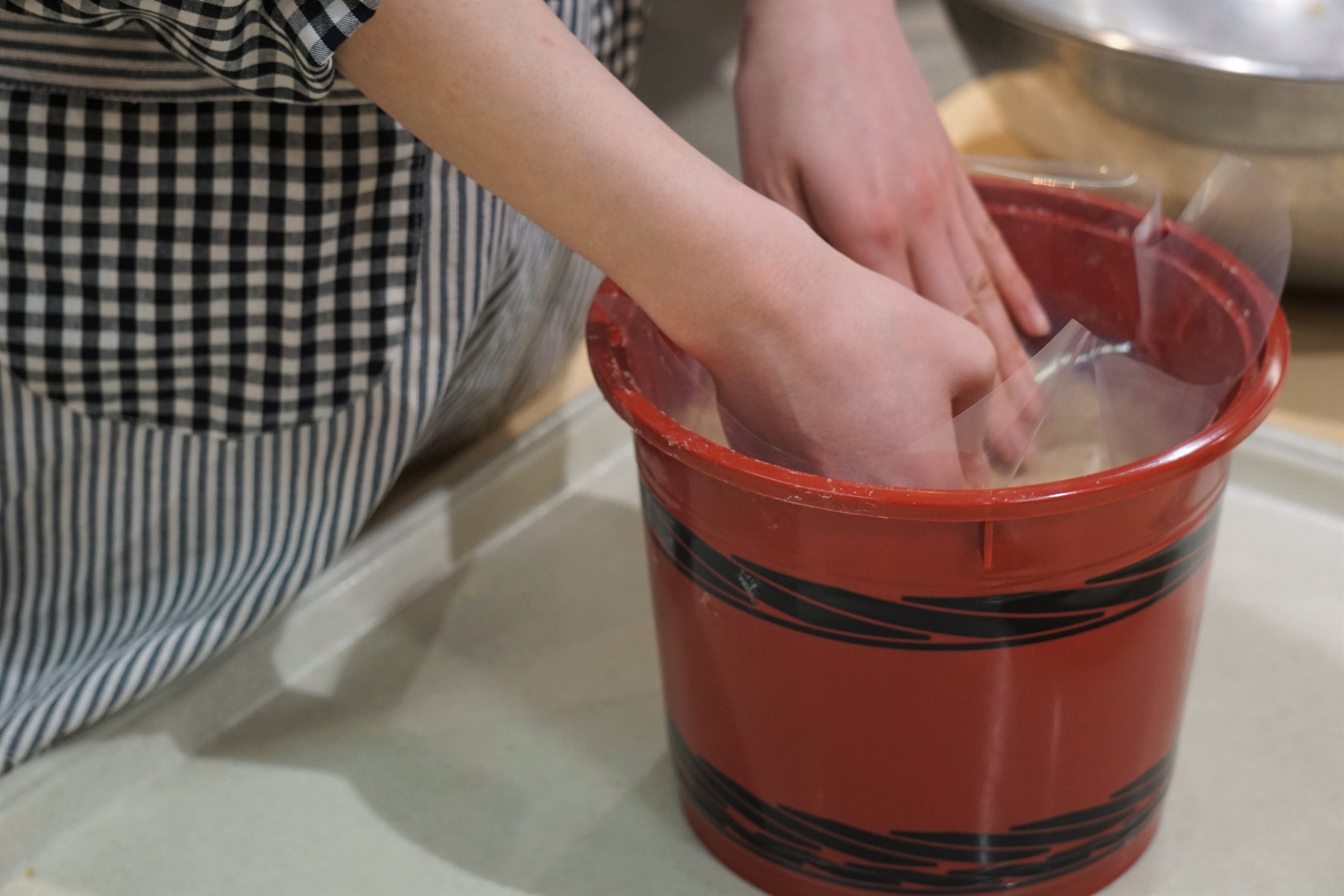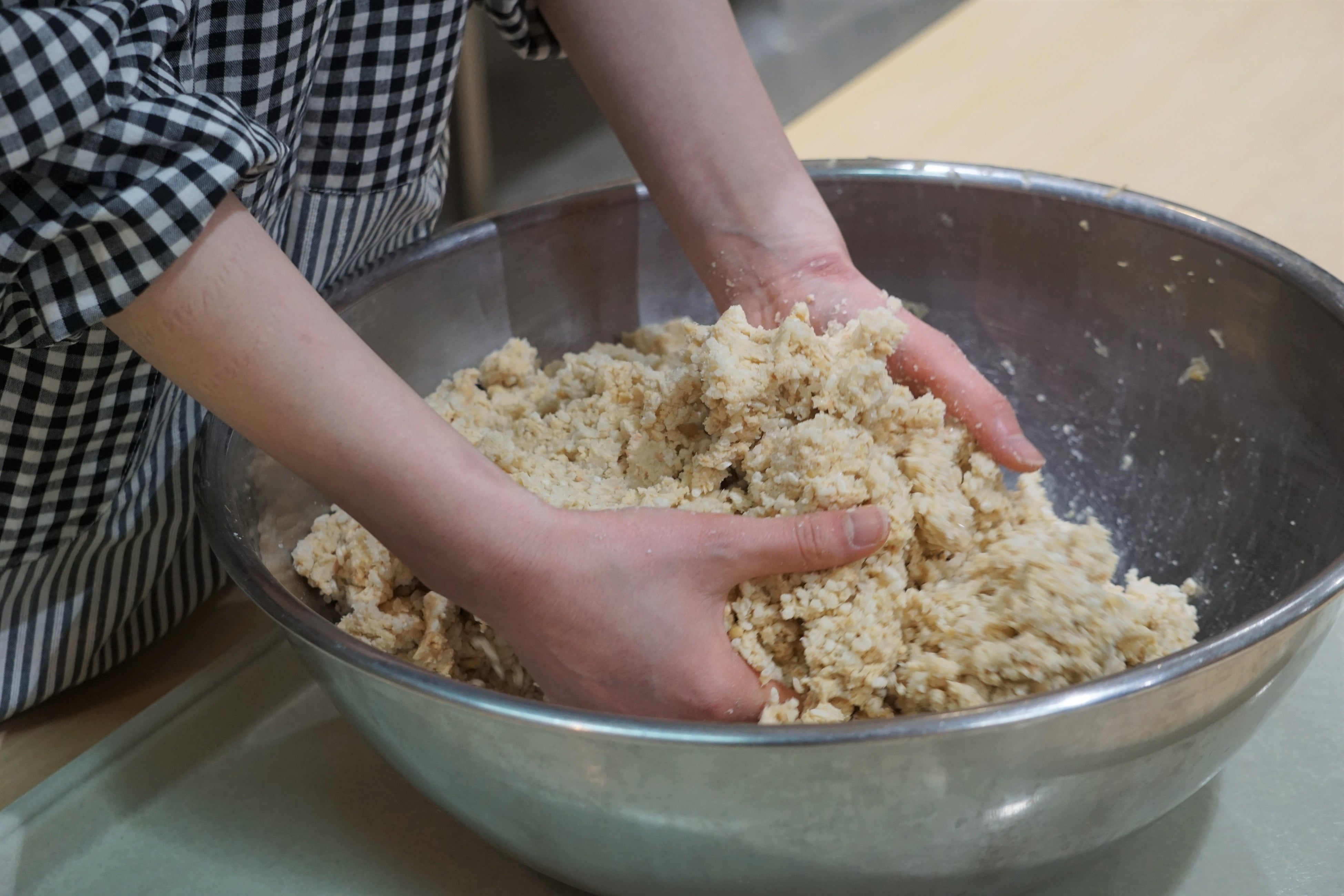 大豆・麹・塩などの材料のほか、エプロンや手袋などの道具もすべてご用意しております。体験は大豆をつぶしたり糀と塩を混ぜるといった工程を行っていただきます。