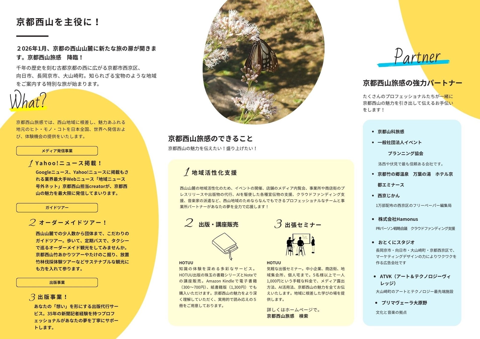 地域密着型メディアの先駆者: 「西京じかん」や「京都市西京区・おとくに)の業界最大手WEBニュース」と連携し、地域の等身大の魅力をリアルタイムで発信します。