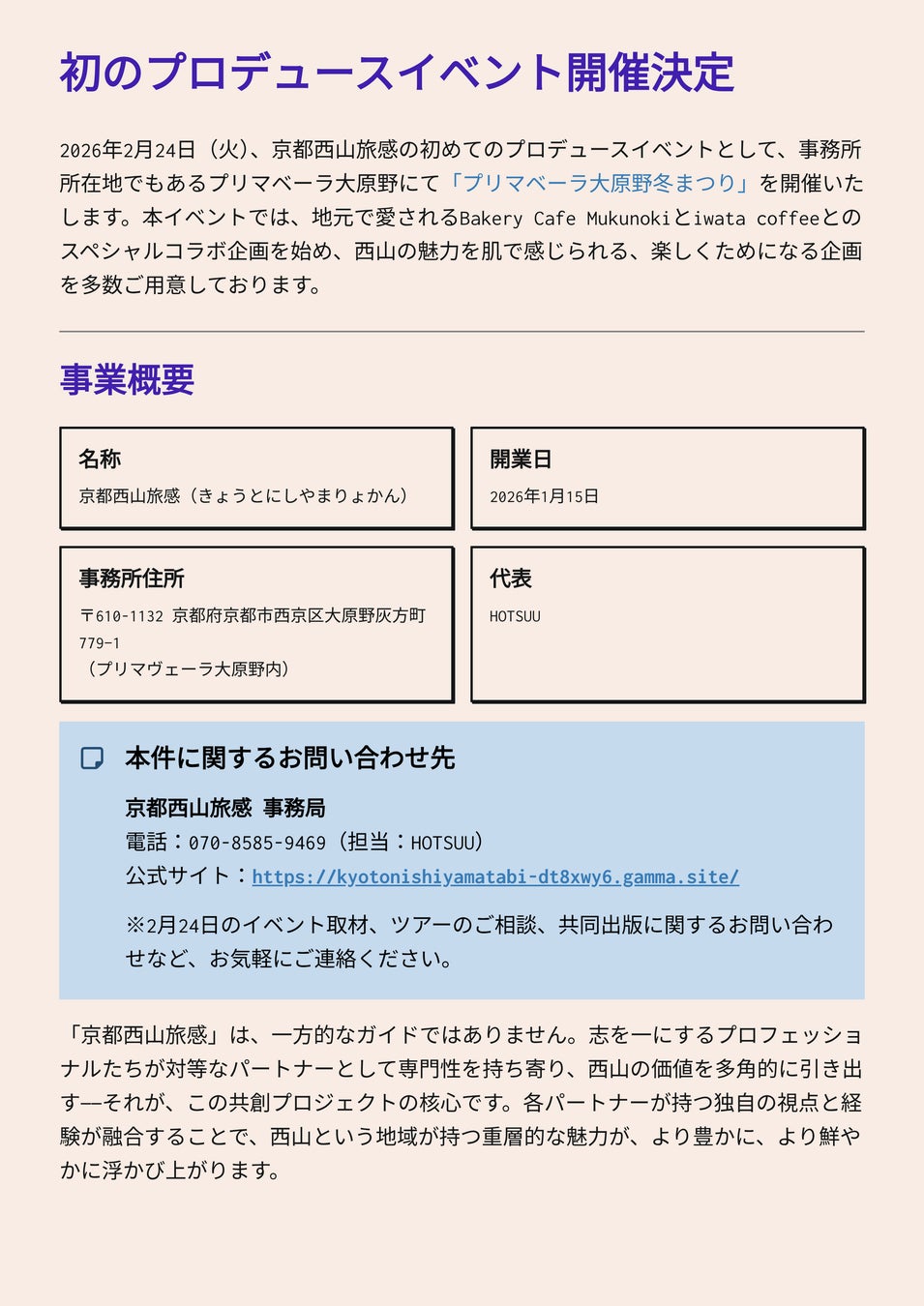本イベントでは、地元で愛される「Bakery Cafe Mukunoki」と「iwata coffee」、「豆腐工房うえだ」とのスペシャルコラボ企画を始め、「オルゴール仙人 清水明さんのオルゴール展示とミニコンサート」、代表のHOTSUUによる「メディア取材をしたくなる事業所の8つの特徴とChatGPTだけじゃない! いまさら聞けない誰でもできる最新AI活用術すべて教えます」の特別セミナーなど西山の魅力を肌で感じられる、楽しくためになる企画を多数ご用意しております。開業したばかりの「京都西山旅感」が描き出す新しい熱量を、ぜひ現地でご体感ください。