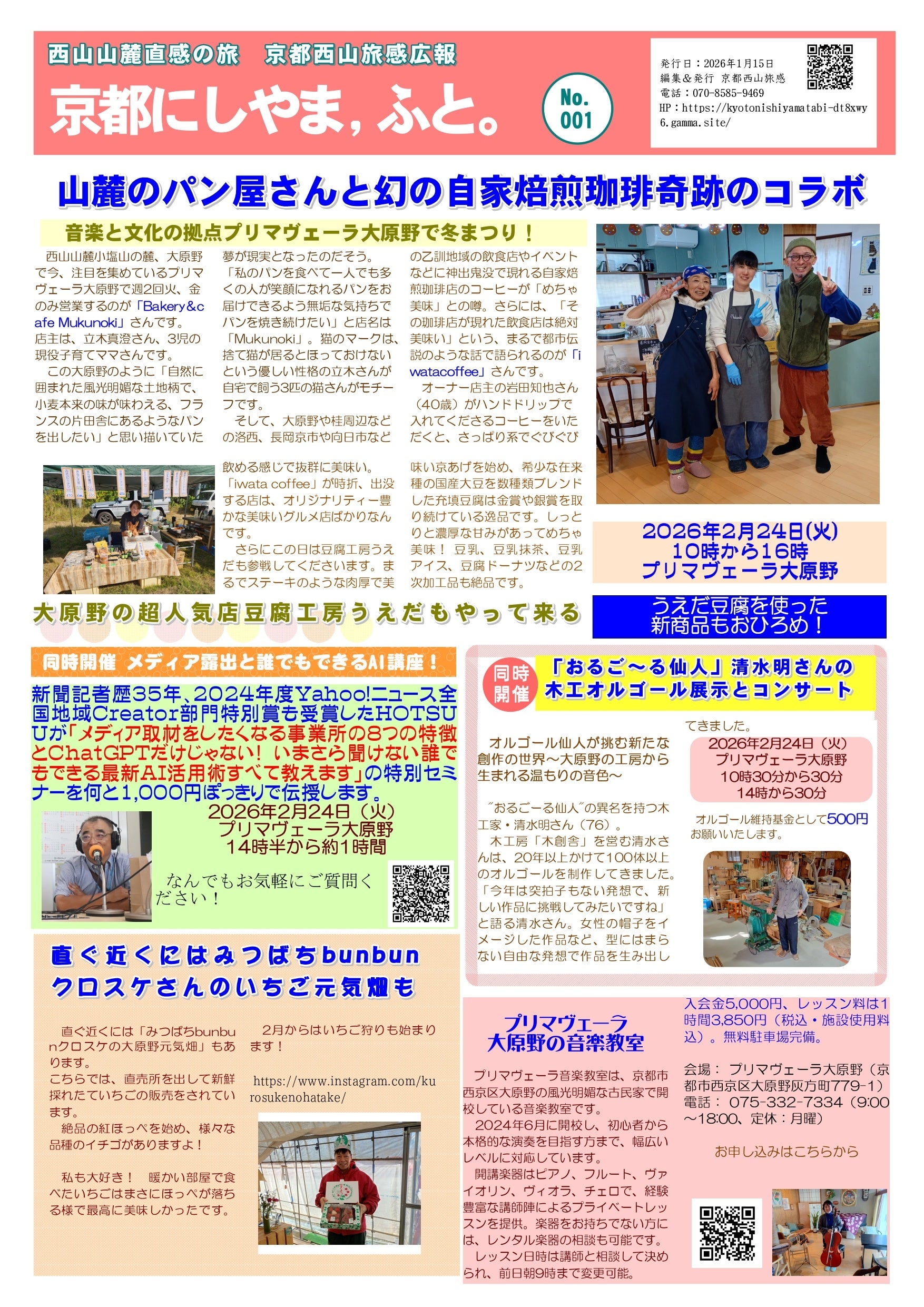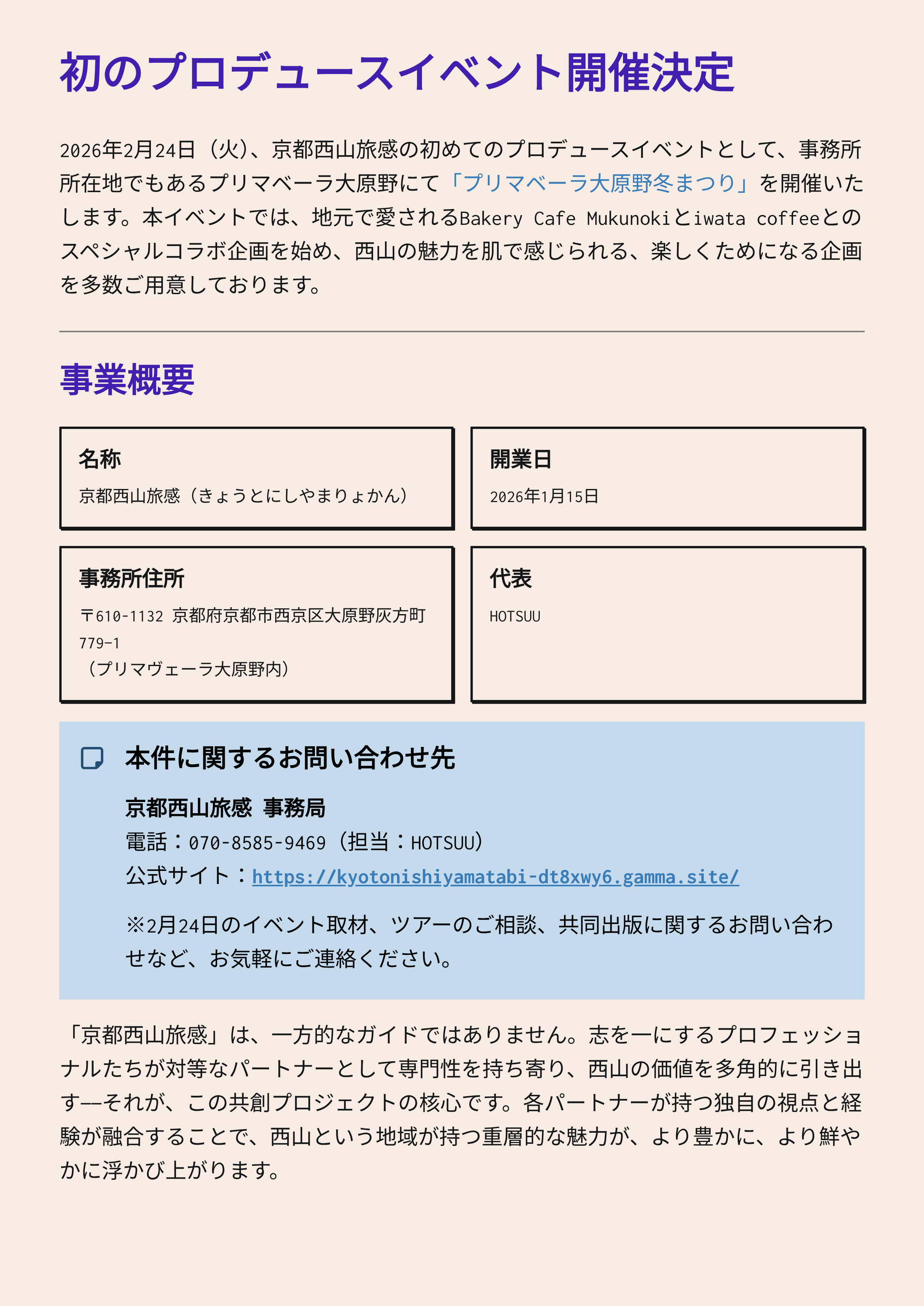 2026年2月24日(火)、京都西山旅感の初めてのプロデュースイベントとして、事務所所在地でもあるプリマベーラ大原野にて「冬まつり」を開催いたします。