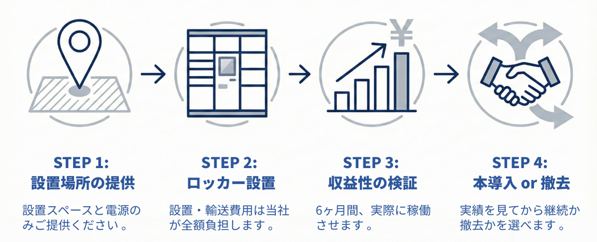 本事業は、現在事業パートナーと連携しながら全国展開を進めています。この流れを加速するため、土地・スペースを保有するオーナー向けに、本格導入の前に実際の利用実績と収益性を確認できる「テスト導入(収益検証モデル)」の設置場所募集を、2026年1月23日より開始いたします。