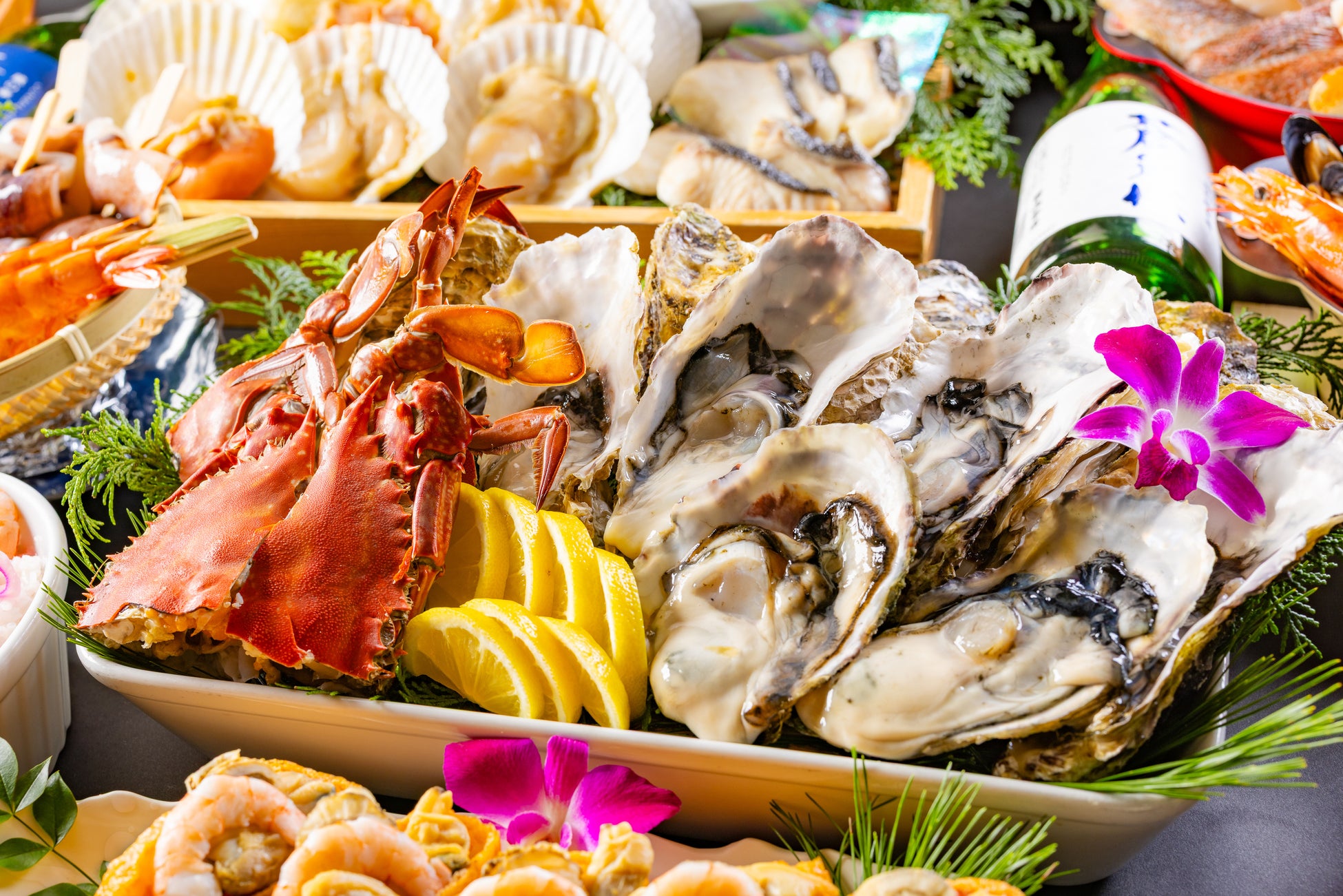 三陸産牡蠣をはじめ、北海道産帆立やカニなど、寒い季節に旨みを増す魚介を中心に取り揃え、お好きなものを好きなだけ、各テーブルで自分のペースに合わせて焼き上げるスタイルが特長です。館内でありながら、浜辺で食事をしているかのような臨場感を楽しめる、気仙沼大島ならではの食体験を提案します。