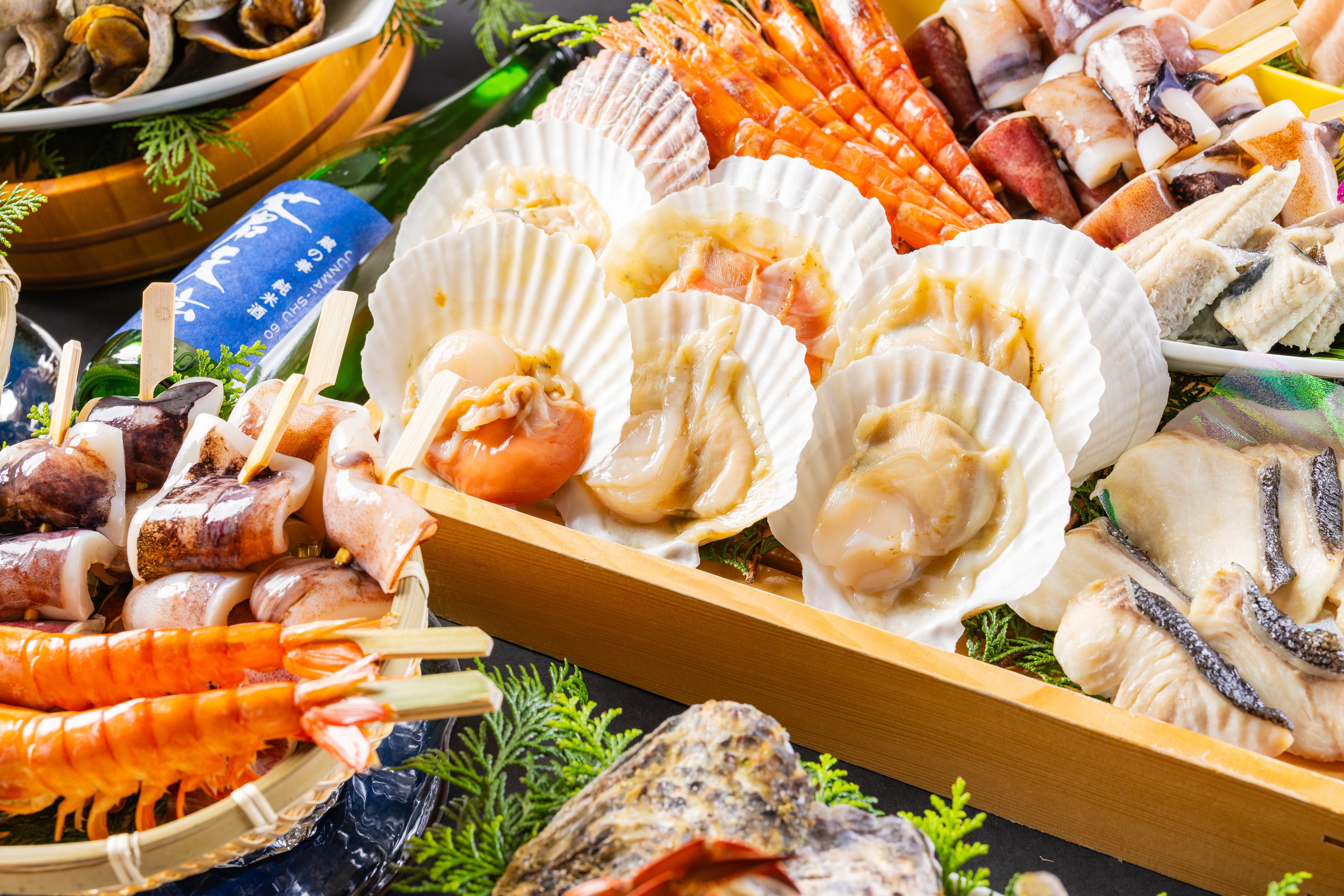 三陸産牡蠣をはじめ、北海道産帆立やカニなど、寒い季節に旨みを増す魚介を中心に取り揃え、お好きなものを好きなだけ、各テーブルで自分のペースに合わせて焼き上げるスタイルが特長です。館内でありながら、浜辺で食事をしているかのような臨場感を楽しめる、気仙沼大島ならではの食体験を提案します。