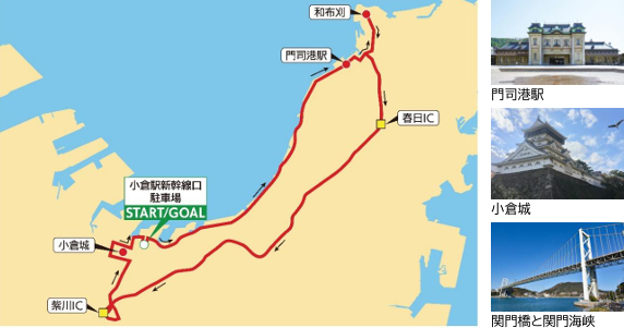 海沿いのレトロな街並みや国の重要文化財である門司港駅、本州と九州を結ぶ関門橋を真下から堪能できるルート。圧巻の景色を楽しめます。