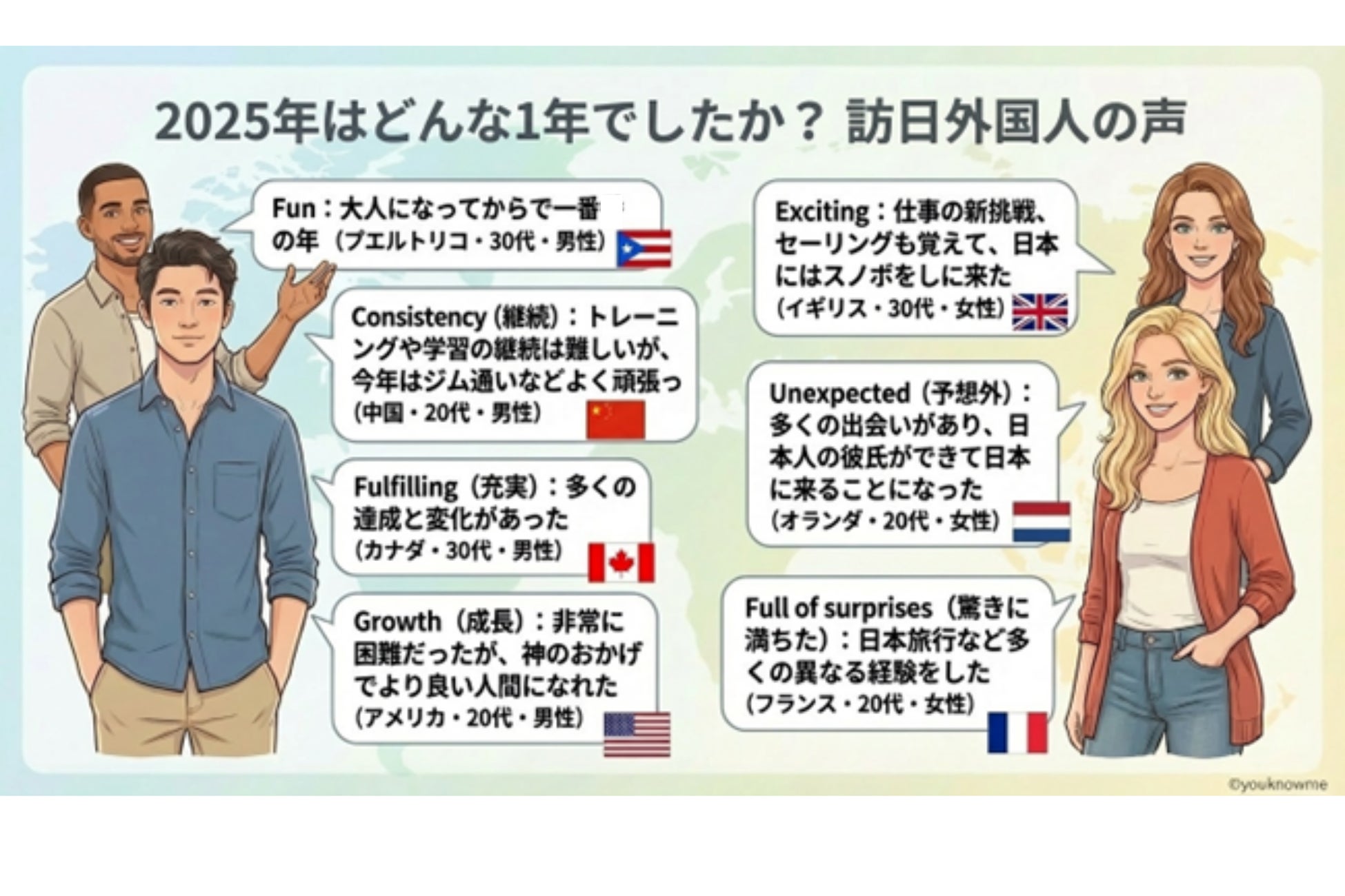 新宿に集まった訪日外国人の皆さんに、「今年の漢字」にちなんで、2025年がどんな年だったかを1単語で表現してもらいました。