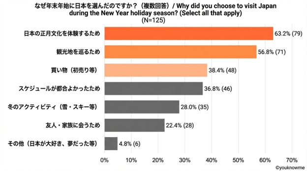 年末年始の長期旅行場所として日本を選んだ理由について聞いてみたところ。「日本の正月文化を体験するため(63.2%)」、「観光地を巡るため(56.8%)」が特に多く、次いで「初売りなどの買い物(38.4%)」、「冬のアクティビティ(28.0%)」となりました。