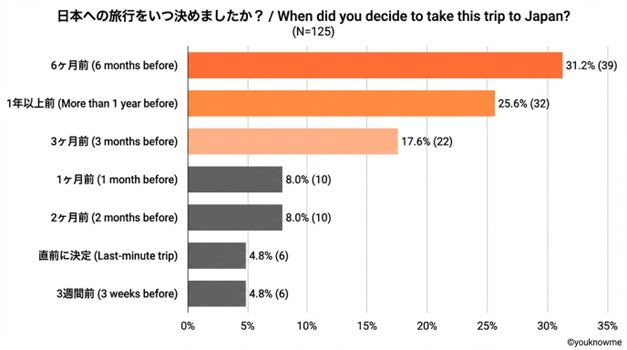 6か月前が31.2%と最も多く、次いで1年以上前から検討する人も25.6%と、半数以上の人が6か月以上前から、日本への長期旅行を計画しているということが分かりました。