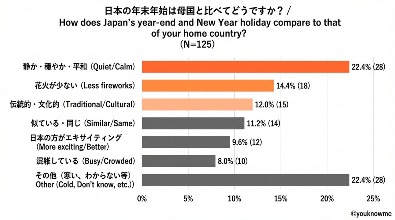 母国と日本の年末年始の雰囲気の違いについて聞いてみたところ(フリーアンサー)、頻出ワードは「静か(Quiet)・穏やか(Calm)・平和(Peacefull)」が最も多く、その他は「花火が少ない」、「伝統的・文化的」というワードが目立ちました。