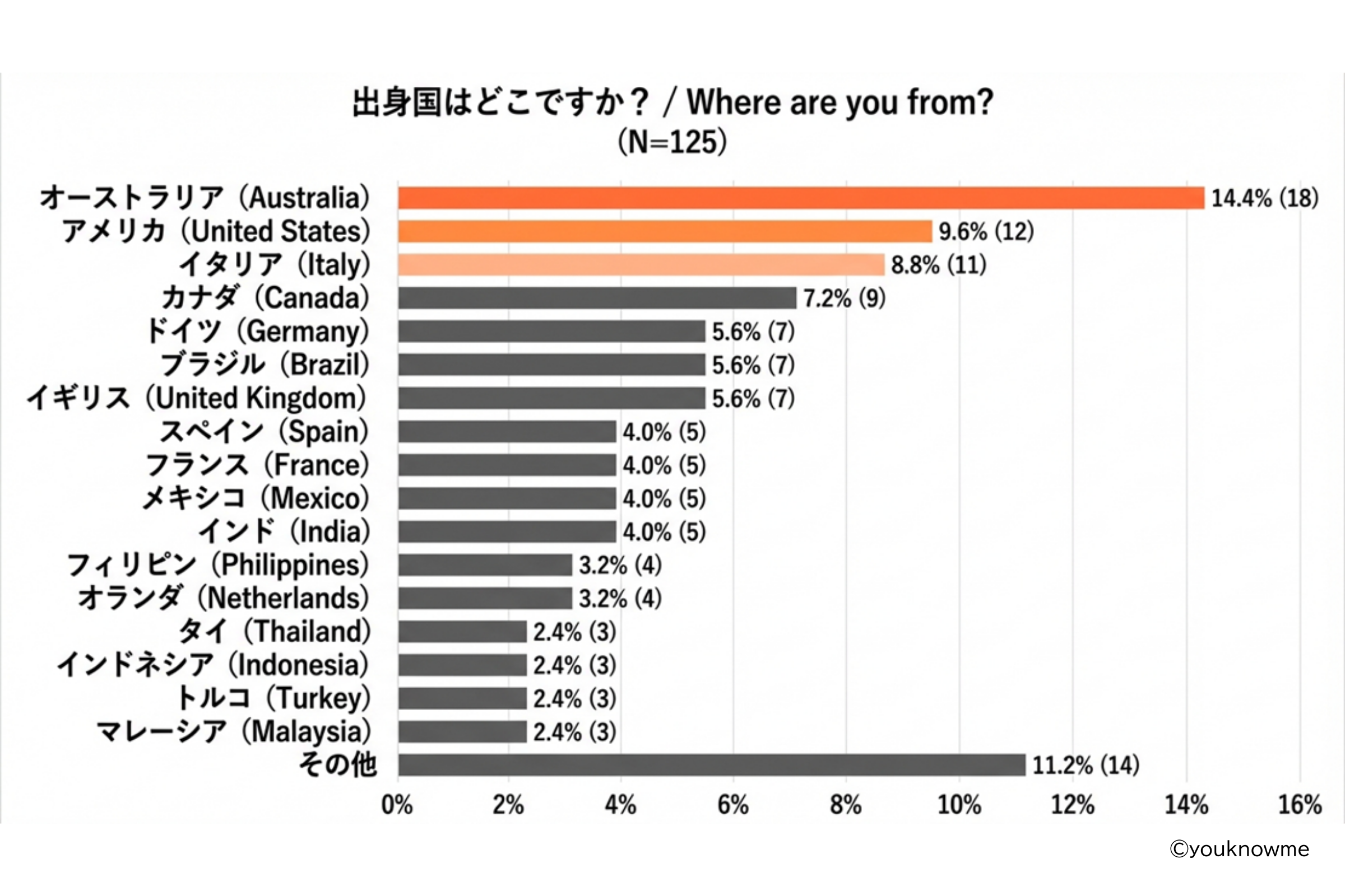 出身国は、オーストラリア(14.4%)が最も多く、アメリカ(9.6%)、イタリア(8.8%)、カナダ(7.2%)等欧米豪、アジア圏までさまざまな国の人が参加しています。