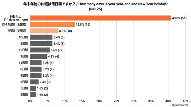さらに、日本と異なっていたのは彼らの休暇の期間です。回答者125名のうち、14日以上(40.8%)、13日~14日(12.8%)と約2週間休暇の人が半数以上という結果となりました。