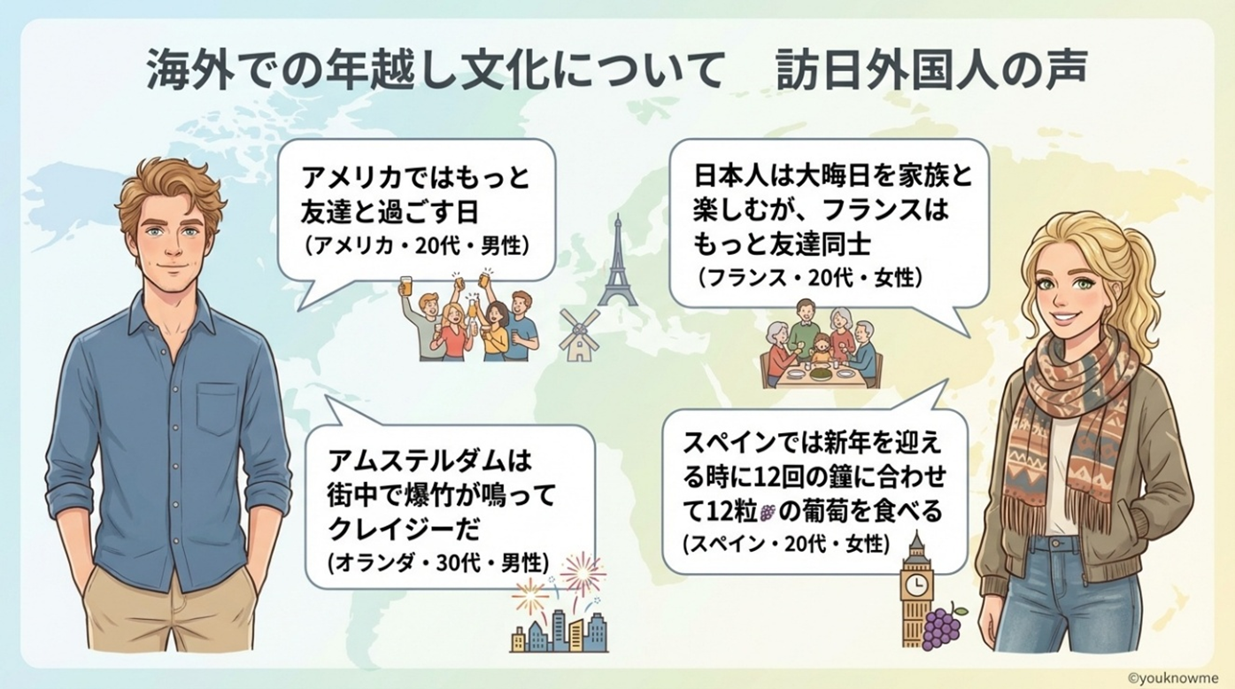 また、日本は年越しを家族で迎える人が比較的多いのに対し、アメリカやフランスは友人と過ごすことが多いという回答も。家族・友人など親しい人達で集まったり、花火などでニューイヤーを盛り上げて祝うという点は、比較的多くの国に共通して見られました。