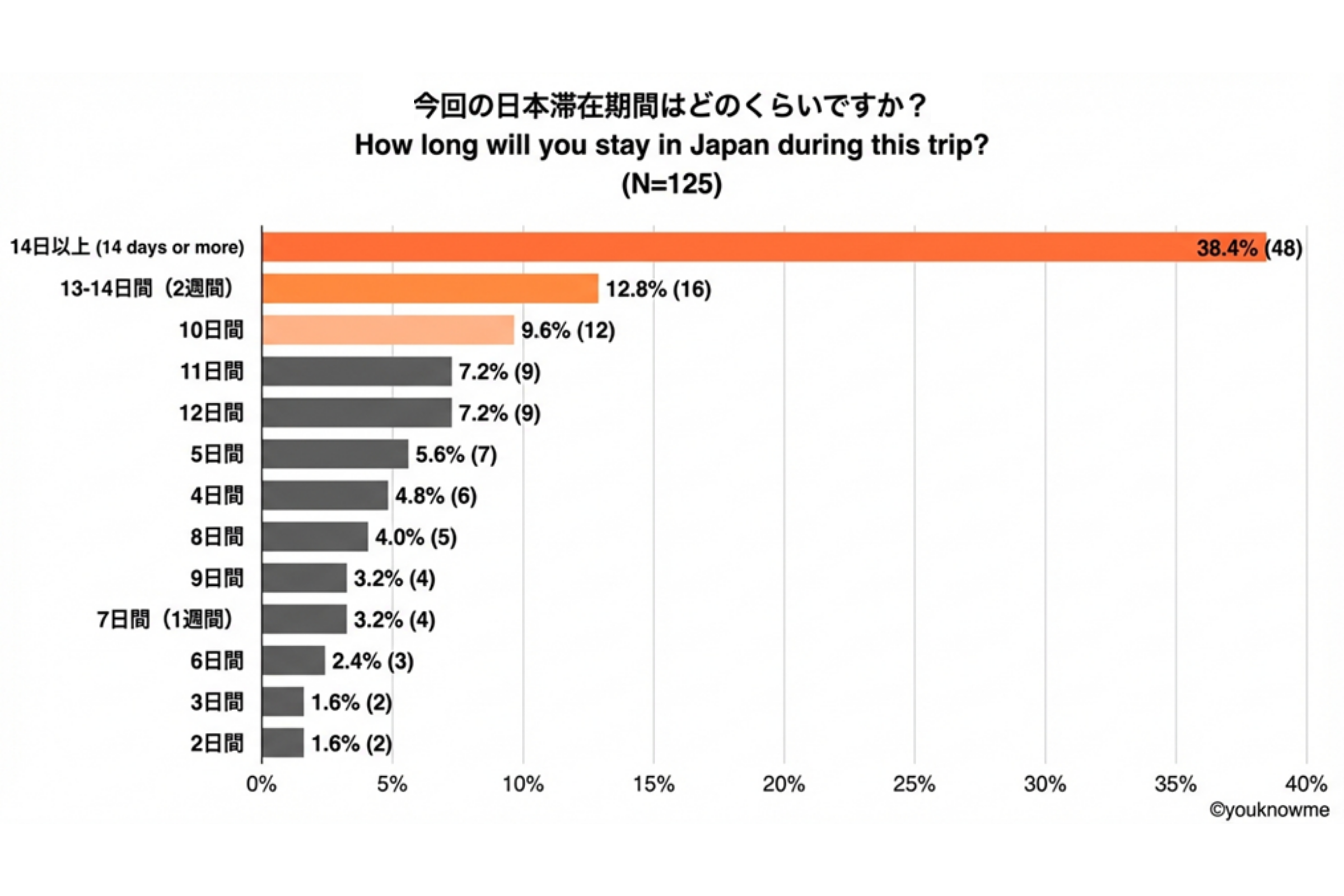 このうち日本に滞在する期間を問う設問では、14日以上(38.4%)、13日~14日(12.8%)という結果となり、年末年始の長期休みは日本滞在がメインであることが分かります。