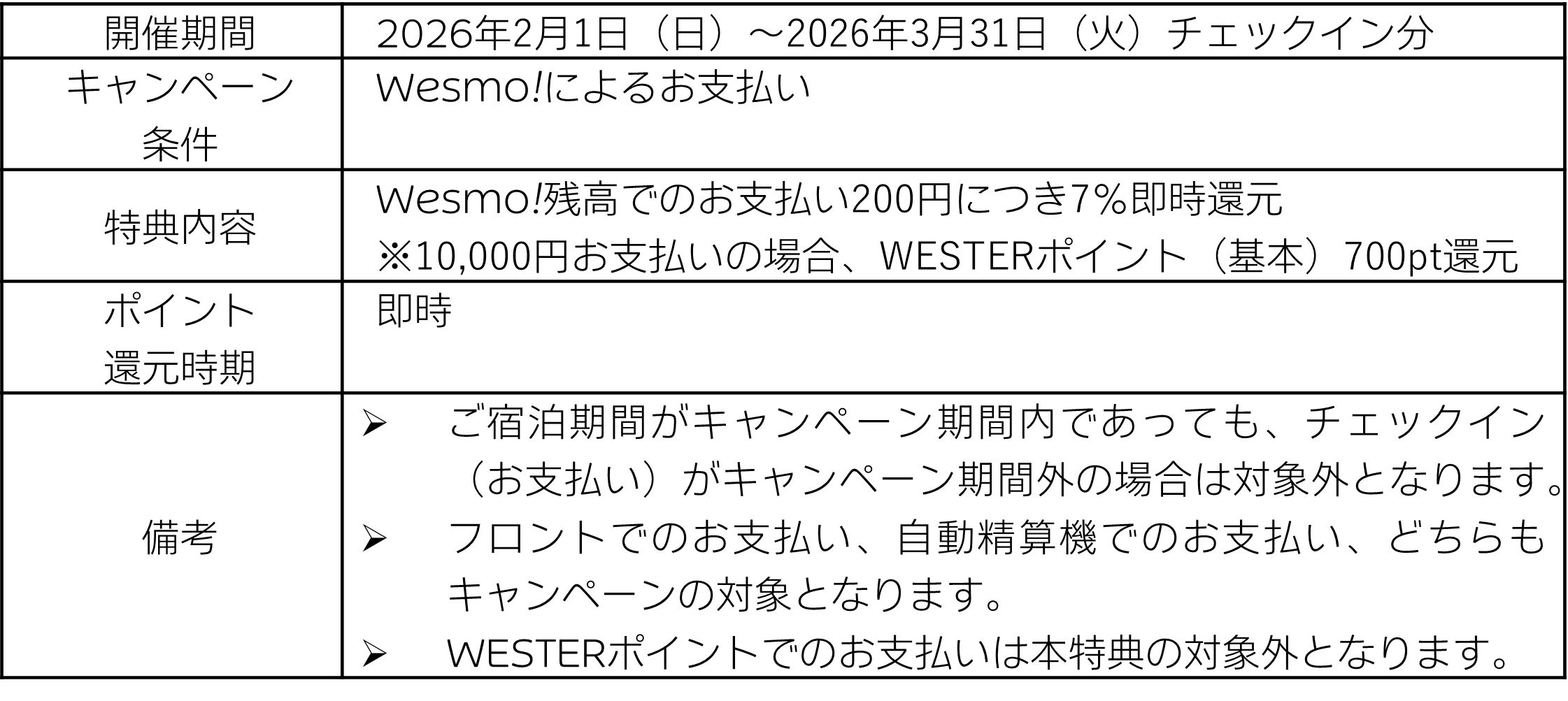 特典2:WESTERポイント7%還元のほか、Wesmo!残高によるお支払いを対象に抽選で無料宿泊券や朝食券があたるキャンペーンもダブル開催!