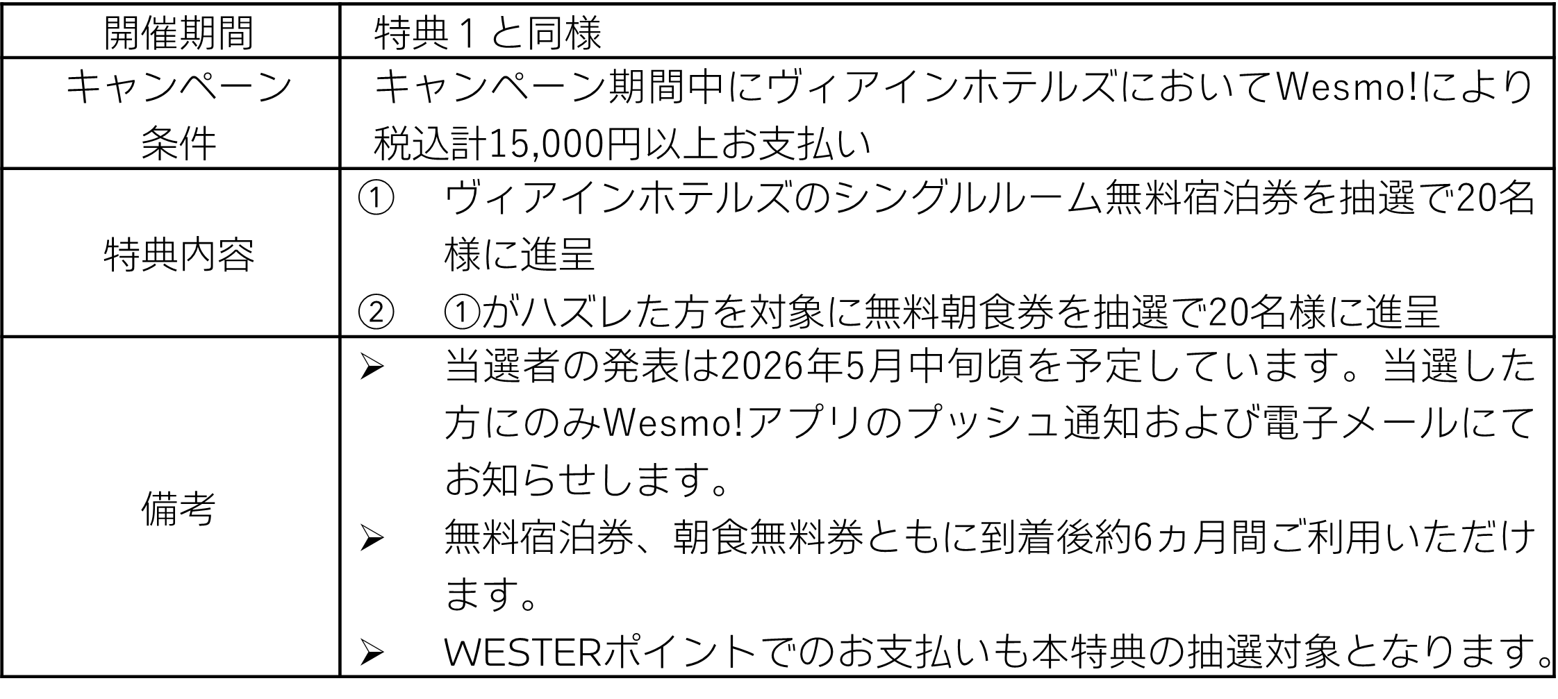 特典として期間中にヴィアインホテルズにおいてWesmo!によりお支払いいただくと、WESTERポイント(基本)が通常の14倍となる7%即時還元するほか、抽選により無料宿泊券や無料朝食券が当たるW特典を用意しています。