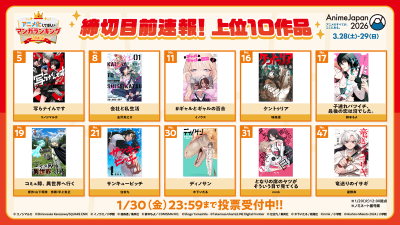 「アニメ化してほしいマンガランキング」は、既刊の単行本作品や連載中作品の中から“アニメ化してほしいマンガ”を一般投票で選ぶ「AnimeJapan」恒例の人気企画です。通称《アニラン》として親しまれ、過去には『SPY×FAMILY』や『薬屋のひとりごと』、『【推しの子】』などが上位にランクインし、アニメ化・ヒットへとつながるなど注目を集めています。昨年は総投票数15万票超えの反響を受け、今年もノミネート募集を経て全48作品がエントリーし、「写らナイんです」や「サンキューピッチ」など上位10作品の締切目前速報が公開となりました。本投票は1月30日(金)まで。アニメ化を願う“推しマンガ”に、ぜひあなたの1票をお寄せください。