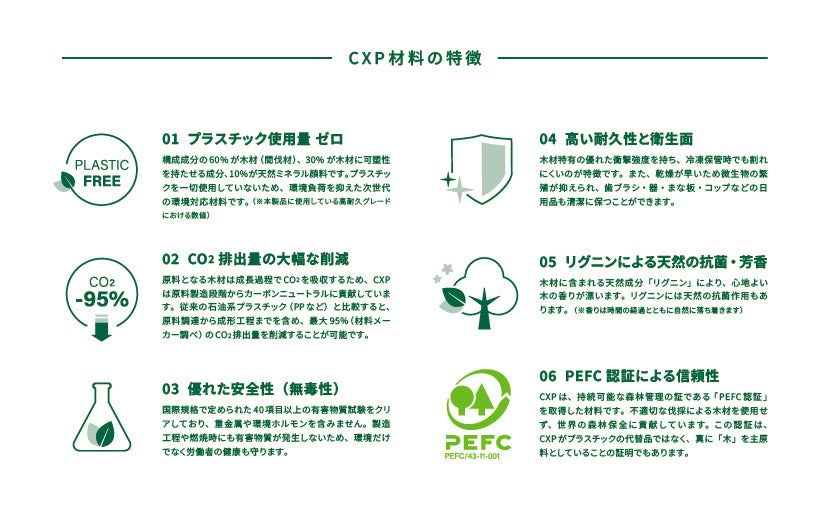 今回の目玉として、プラスチックを一切含まない間伐材由来の次世代成形素材である「Cellulose Cross-linked Polymer CXP(以下CXP)」を採用した、新型ハンドルの歯ブラシ『Zero Plastic Handle™』を初公開いたします。環境配慮と洗練されたデザイン、そして従来の自然素材アメニティの課題であった衛生面をクリアし、ラグジュアリーホテルの上質な空間にも調和する新しい選択肢を提案します。