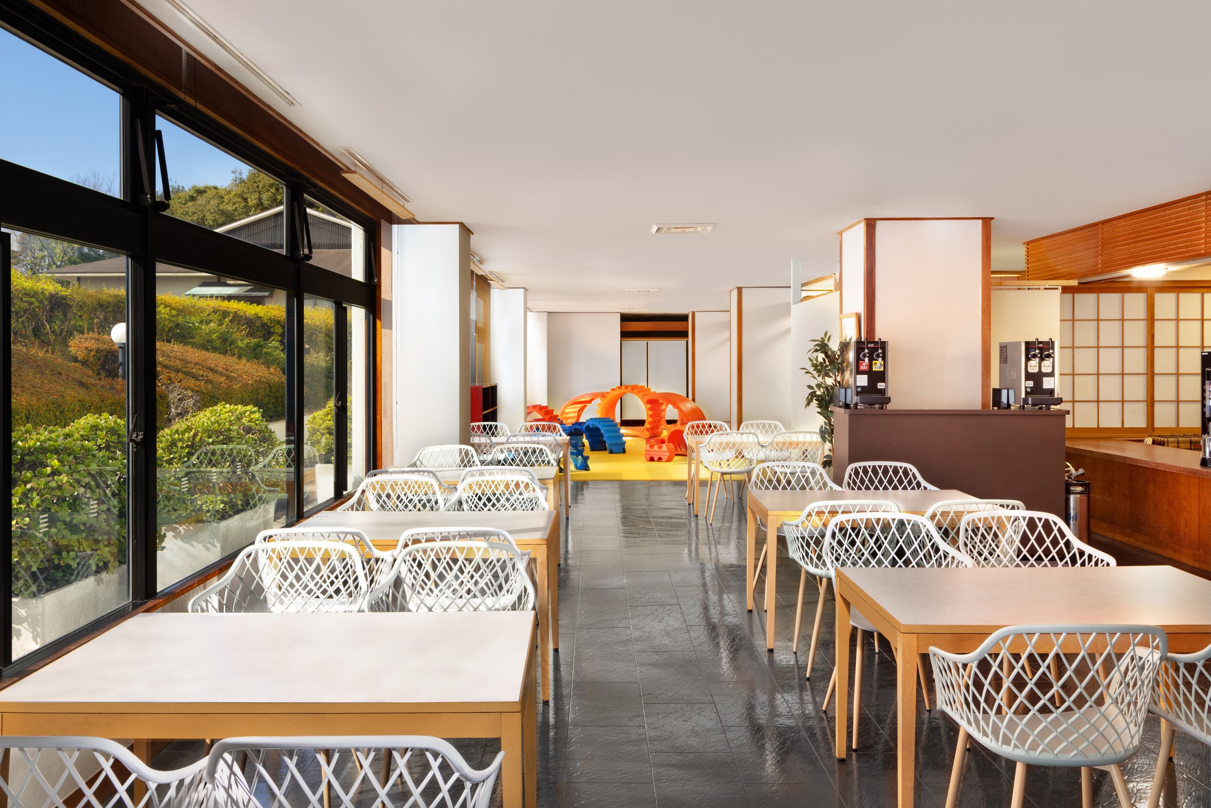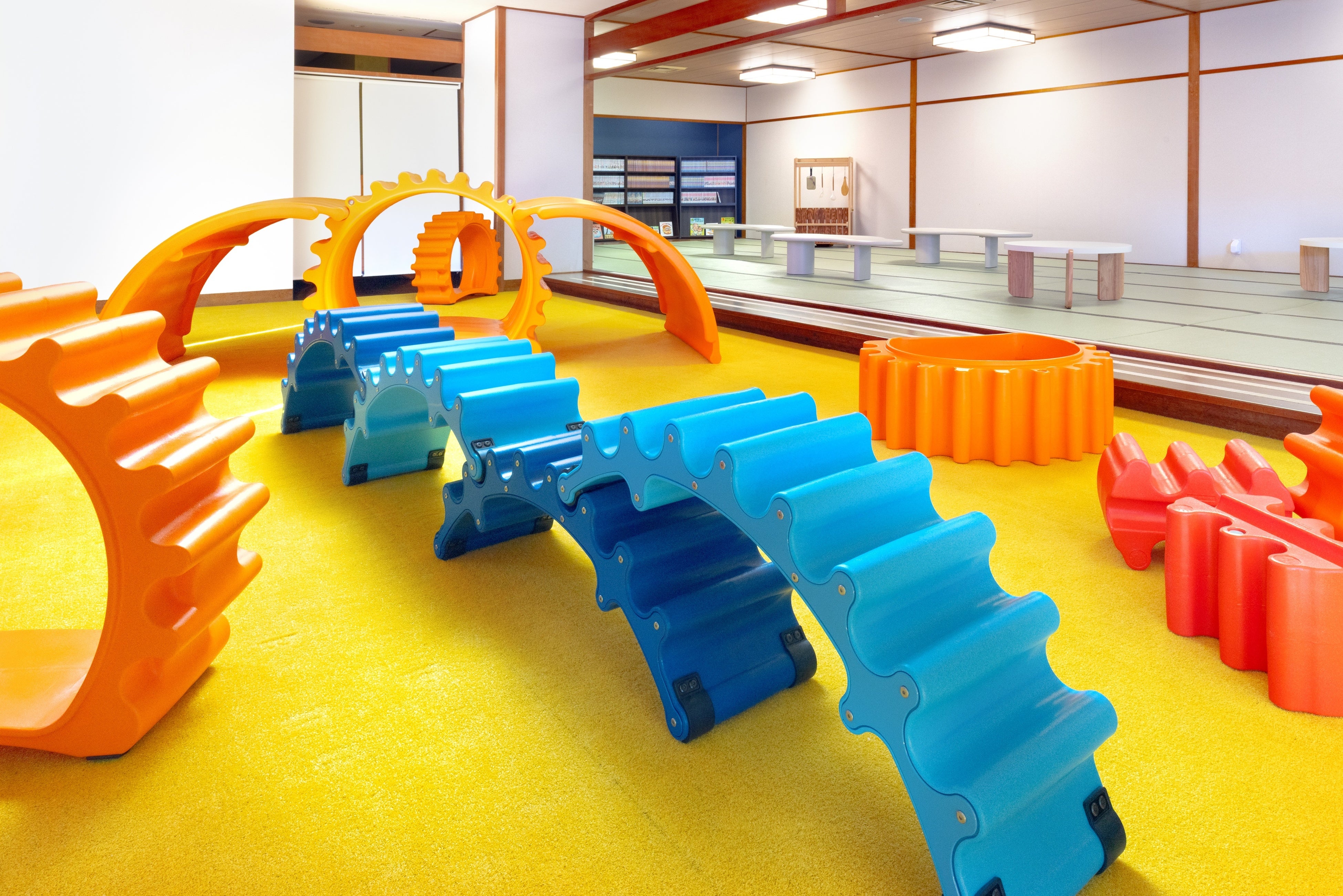 芝生エリアには、創造性を育む形の異なる大きなブロック「MOPPS(モップス)」を設置。自由に組み合わせることで、橋や秘密基地をつくったり、乗り物に見立てたりと、体を動かしながら創造力を育み、親子が一緒に夢中になれるプレイエリアです。畳エリアには、絵本や人気の漫画、ボードゲームなどを取り揃え、のんびりと過ごせるくつろぎスペースをご用意。お子さまも大人も読書を楽しんだり、旅先ならではの語らいを深めたりと、思い思いの時間を心地よく過ごせます。ラウンジ内には、駄菓子コーナーやドリンクスペースも設け、親子で語らう時間はもちろん、お子さまが遊んでいる様子を見守りながら、大人がひと息つける時間も大切にしています。