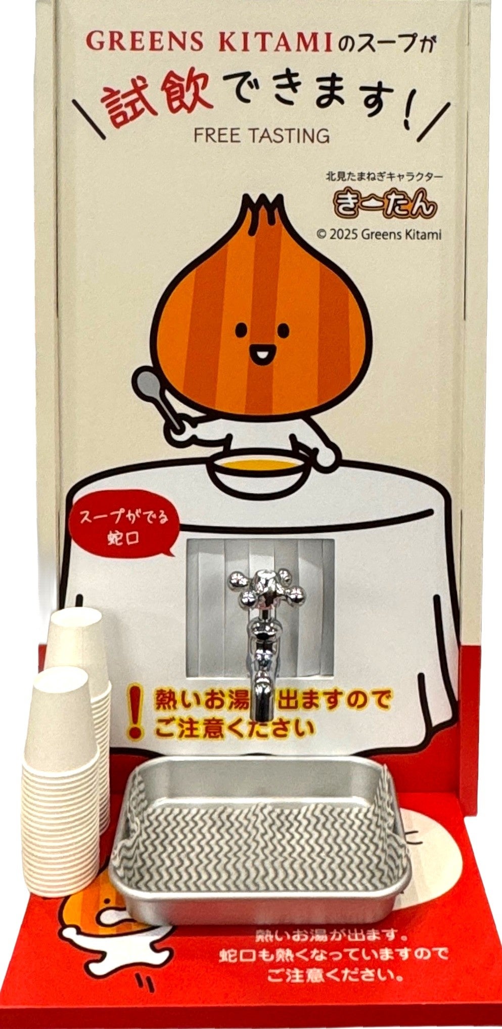 提供するスープは、北見市に本社を構え、北海道産食材を使用した加工食品メーカー・株式会社グリーンズ北見の人気商品「北海道オニオンスープ」。雪まつり見学や外出から戻った宿泊者を、湯気とともに立ちのぼるオニオンスープの香りと、思わず足を止めてしまう驚きの演出で温かく迎える、冬の北海道ならではのおもてなしです。