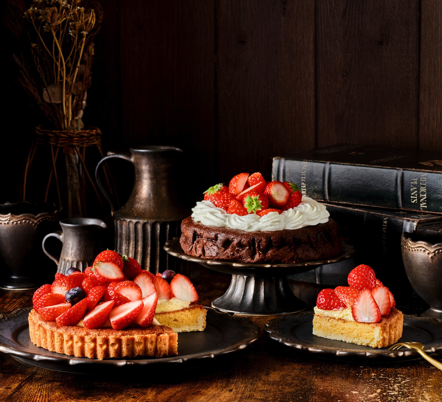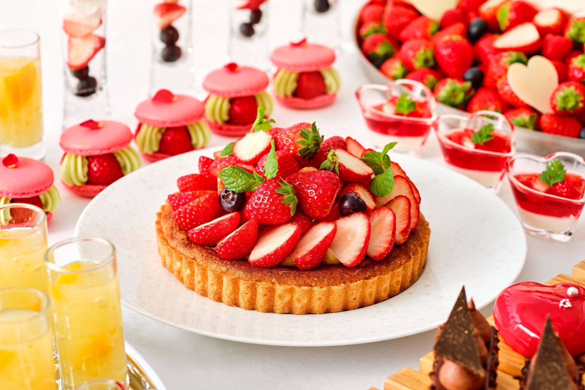 真っ赤に色づいた苺を贅沢にあしらったタルトをはじめ、しっとりと焼き上げた濃厚なガトーショコラ、口に運ぶとやさしくほどけるような食感が魅力の苺のブランマンジェをご用意。