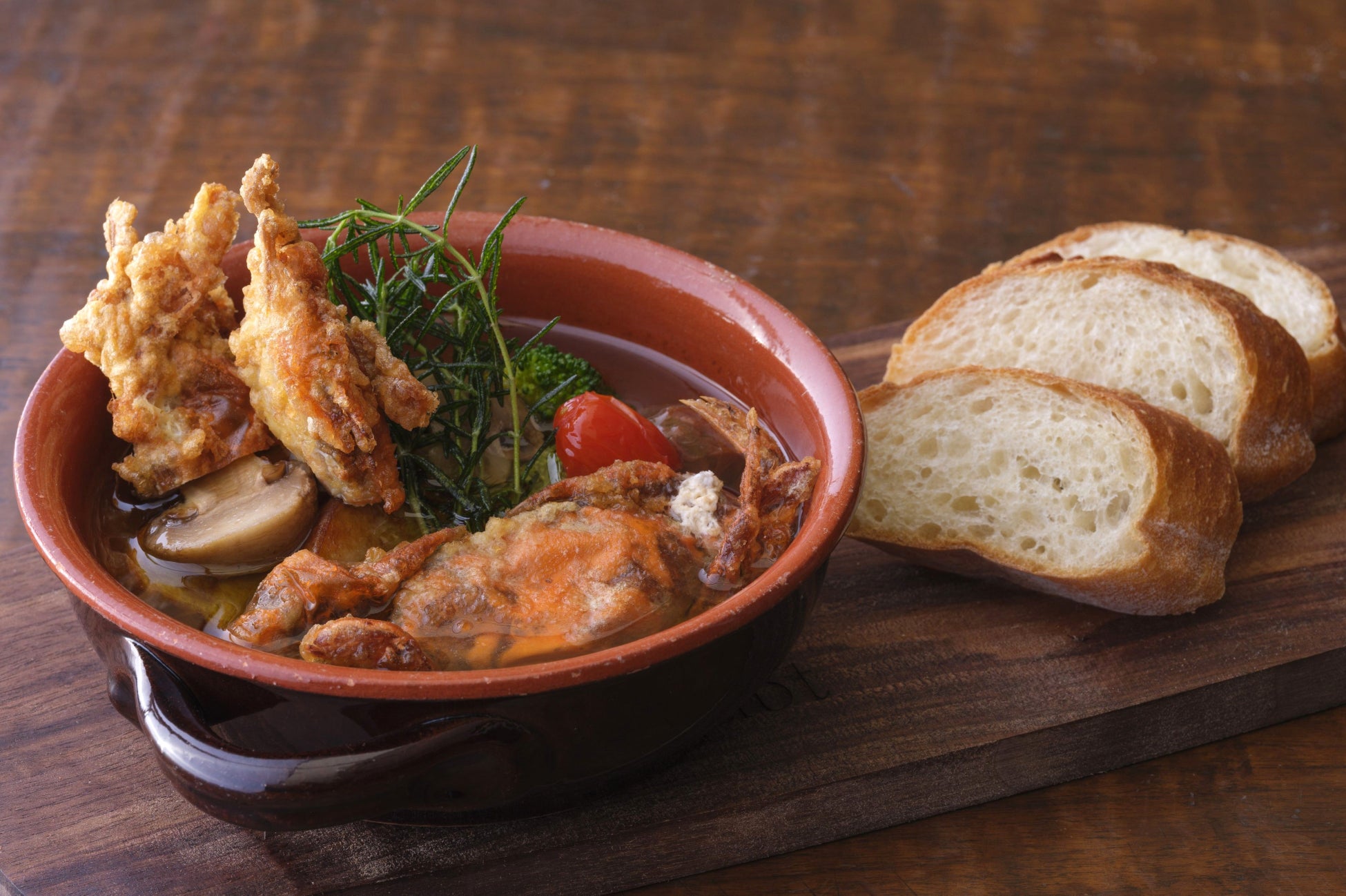 ズワイガニと魚介類の繊細な甘み・旨みを、ブイヨンで仕立てたスープ仕立ての一皿です。