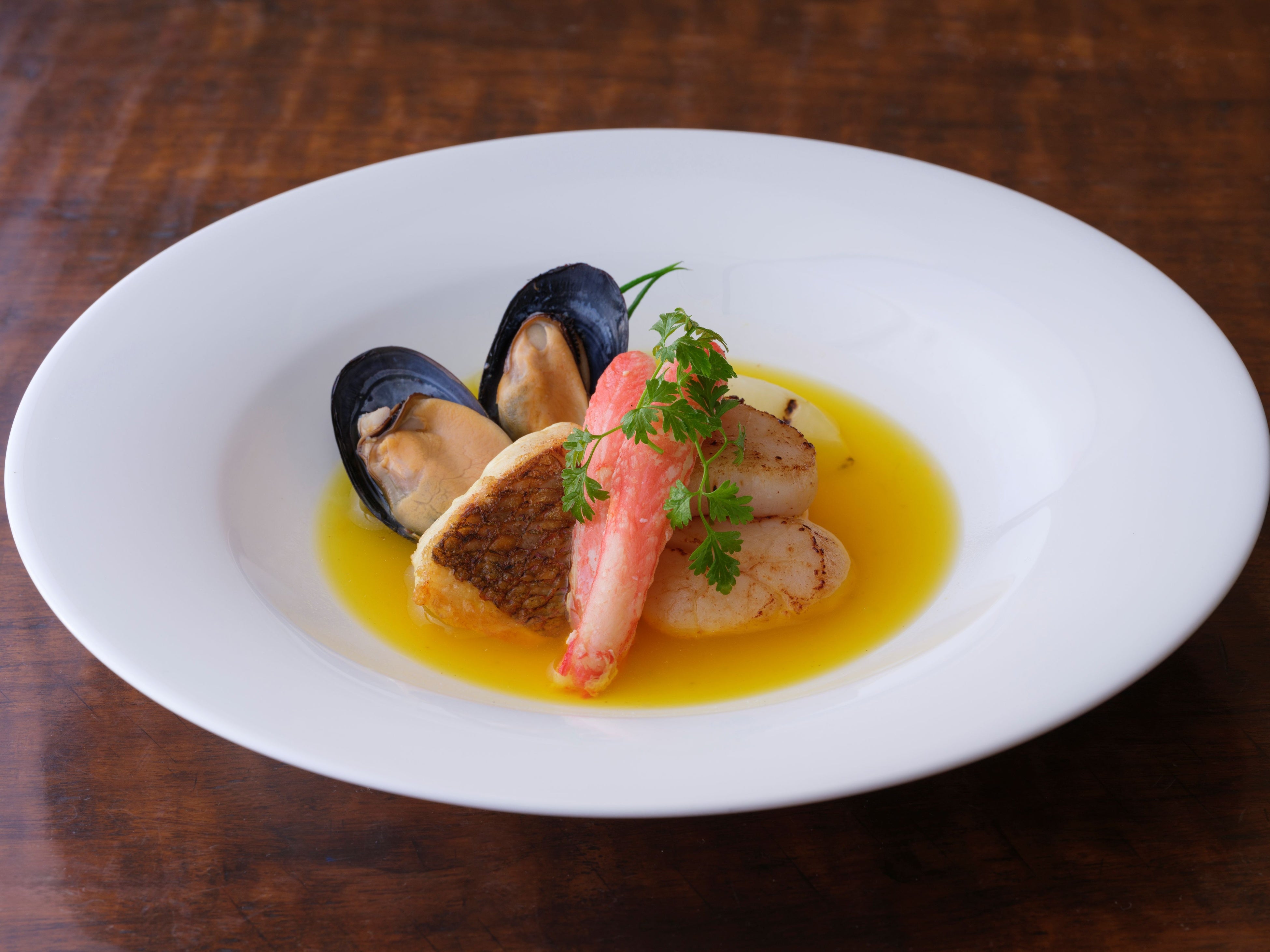 ズワイガニと魚介類の繊細な甘み・旨みを、ブイヨンで仕立てたスープ仕立ての一皿です。