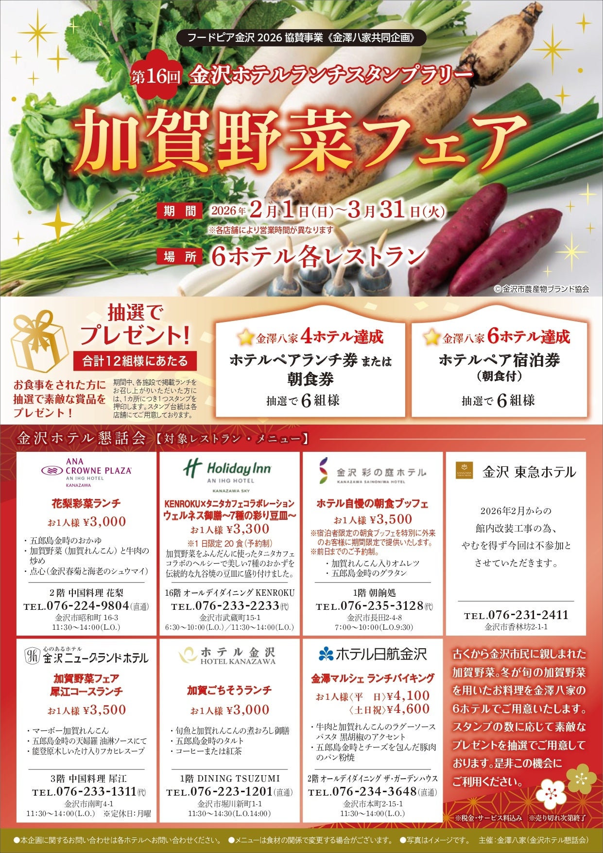 本企画は「金澤八家(金沢ホテル懇話会)」の共同プロジェクトのひとつ、グルメ開発の一環で、地元食材の魅力を発信する恒例の人気企画です。各ホテルが加賀れんこんや五郎島金時など、旬の加賀野菜をどのような料理に昇華させるのかをご期待ください。