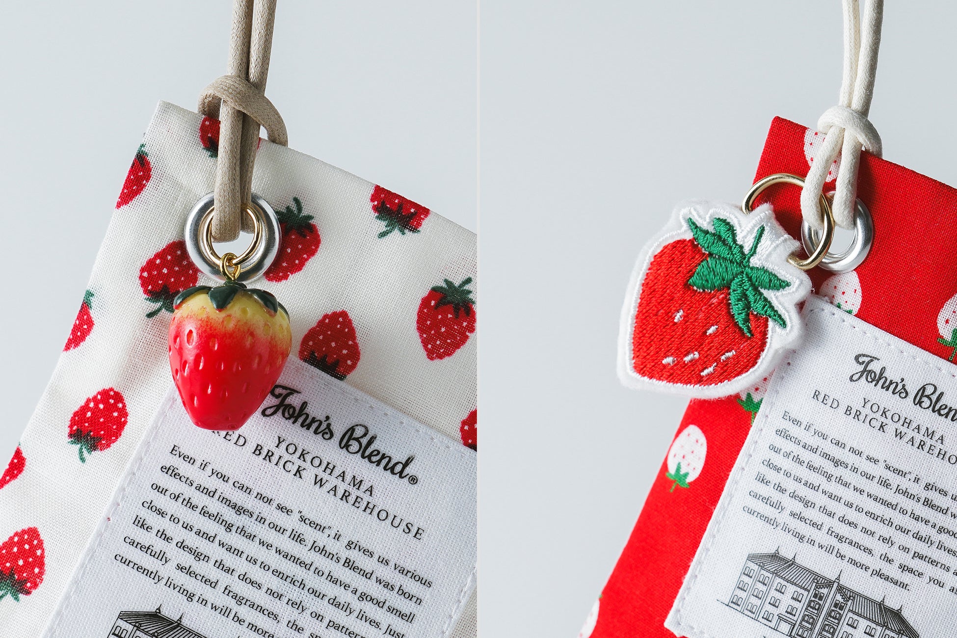 7種のいちご柄サシェ袋から選び、香りを詰め、最後にいちごのチャームを添える。