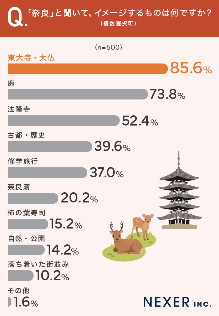 そのほか、「古都・歴史」(39.6%)や「修学旅行」(37.0%)といった回答も多く、奈良が歴史や学びの場として親しまれている様子がうかがえます。
