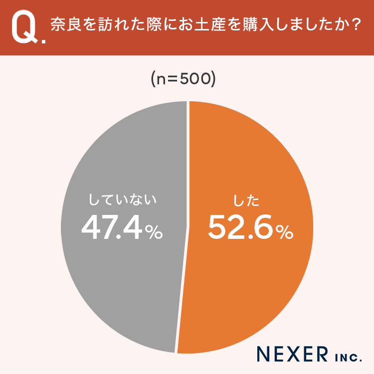 その結果「購入した」と回答した人は52.6%、「購入していない」は47.4%となりました。約半数の人がお土産を購入しており、奈良旅行の思い出として何かを持ち帰りたいと考える人が多いことがうかがえます。
