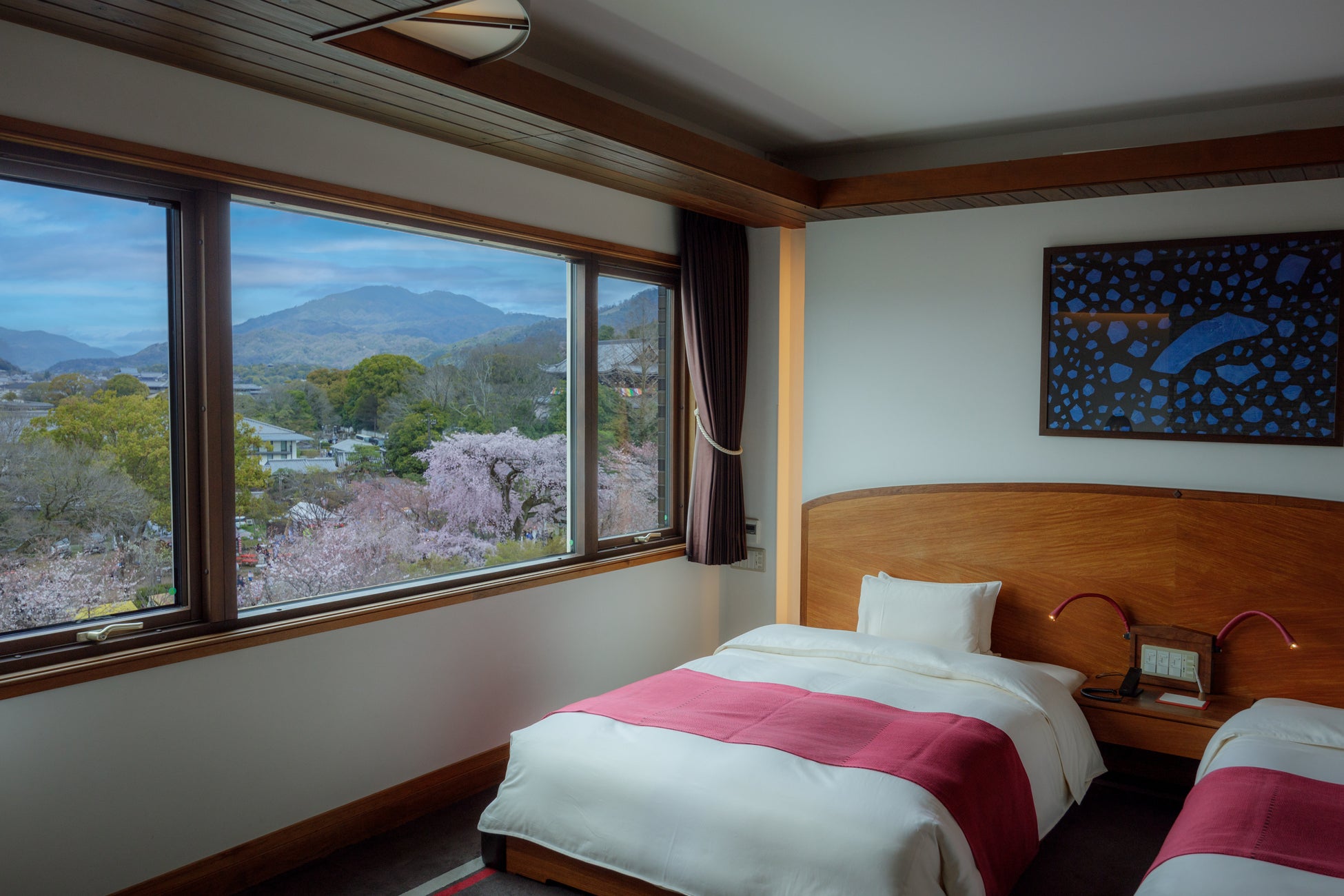 本プランは、ホテル館内から円山公園に広がる桜景色を望む立地を生かし、滞在を通して京都の春を楽しめる点が特徴です。本館「長楽館(国指定重要文化財)」および客室のある新館のいずれからも円山公園を望むことができ、京都の桜が見せる昼と夜、それぞれの表情をご覧いただけます。