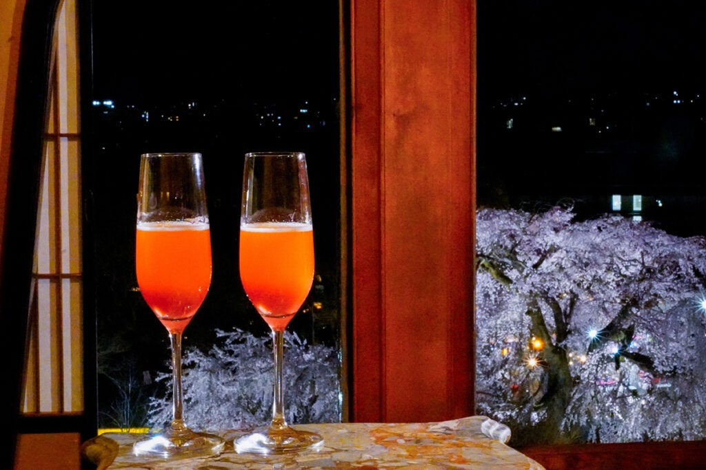 滞在中には、通常非公開の和室「御成の間」を特別に開放。かがり火に照らされた祇園枝垂れ桜を眼下に望みながら過ごすひとときは、歴史的空間と自然美が調和する、長楽館ならではの体験です。