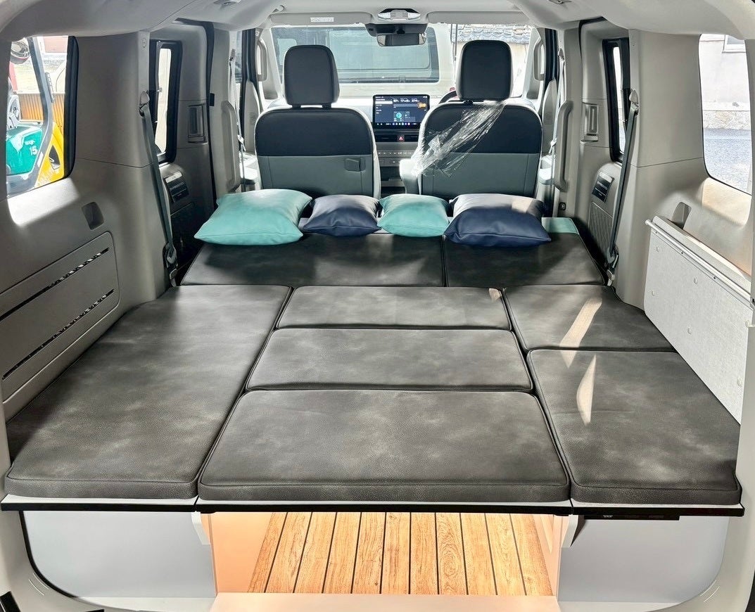 「本車両は、停車中も家電を気兼ねなく使いたい少人数層をターゲットに、「停まる(泊まる)事で、価値が生まれる」というEVならではの滞在体験を提供します。電気を我慢しないことが旅の快適さに直結するという考えのもと、走行と生活用電力を一体で設計することで、静寂の中で場所を問わず家電を活用できるストレスのない空間を実現しました。純正シートによる日常の使い勝手を維持しながら、リアには広大なベッドと電子レンジを配した機能的なレイアウトを両立しています。機能だけでなくEVらしい清潔感のあるインテリアにもこだわり、旅のあり方を移動中心のものから、景色の良い場所で過ごす「滞在の質」を大切にするものへと変えていく一台です。」