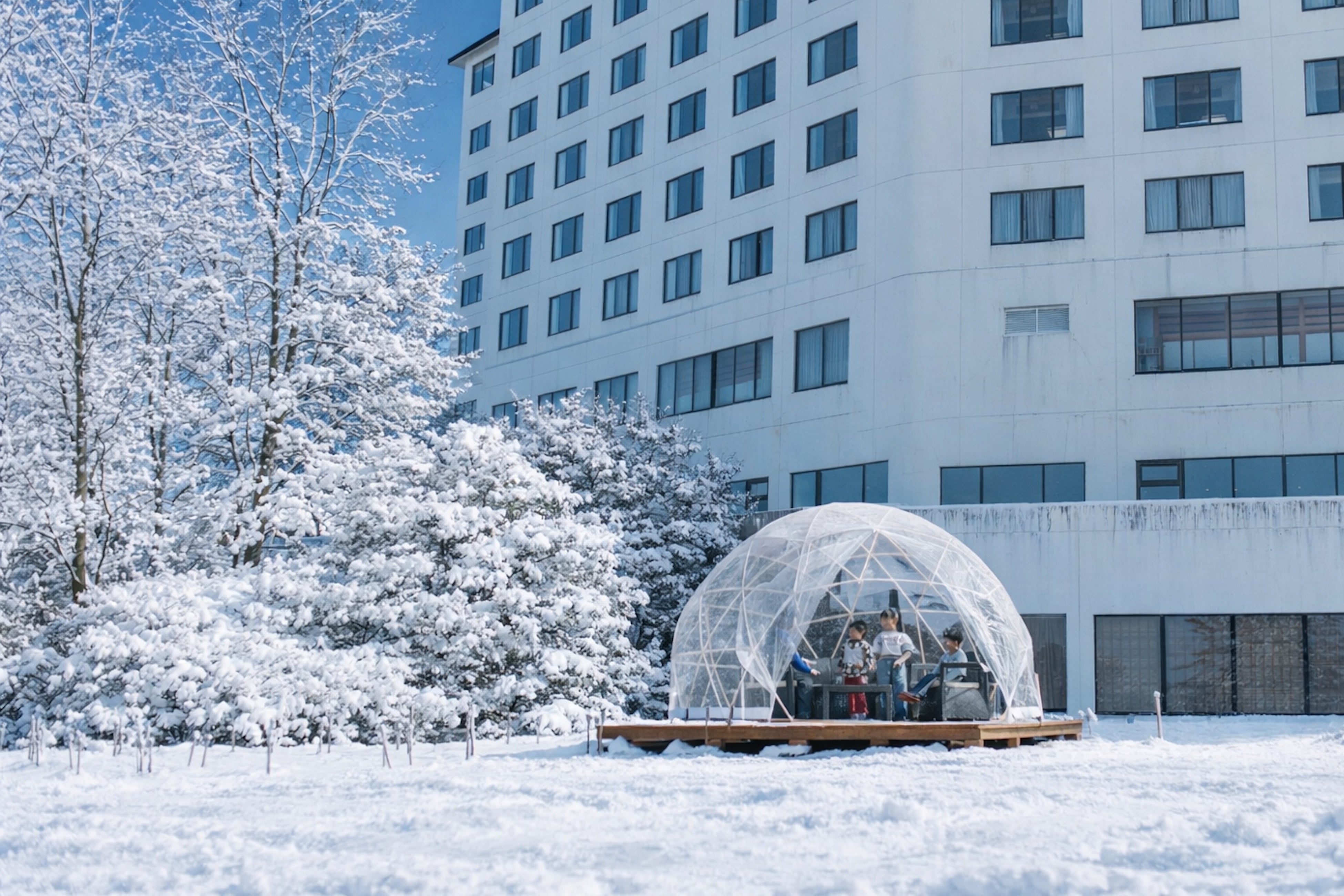 寒い冬の屋外でも暖かく過ごせるよう、雪遊びエリアの一角に、直径3.6メートルのドームテントを設置します。テント内にはブランケットやあたたかい素材のクッションを用意し、寒さを気にせず滞在できる特別な空間です。テントの外壁は透明な素材でできているため、子どもたちが雪遊びを楽しむ様子を、そばでくつろぎながら見守ることができます。雪が降り積もった日には、テントの外側が白く覆われ、まるでかまくらの中にいるような景色になり、雪景色の中で記念撮影ができるフォトスポットとしても活用できます。(※天候状況により、ドームテントの設置が遅れる場合があります。)